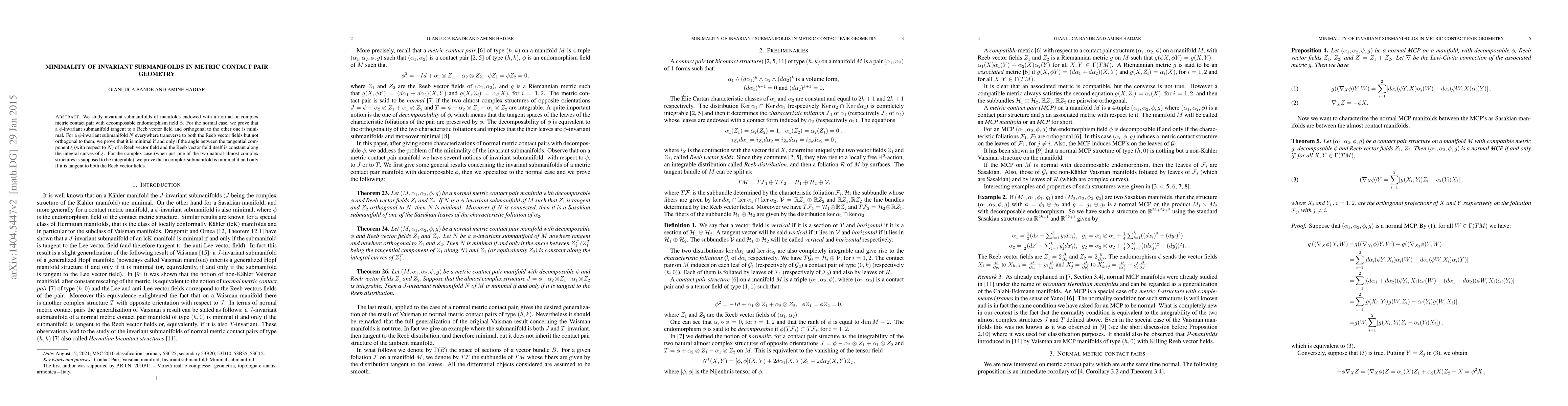 We study invariant submanifolds of manifolds endowed with a normal or complex metric contact pair with decomposable endomorphism field $\phi$. For the normal case, we prove that a $\phi$-invariant submanifold tangent to a Reeb vector field and orthogonal to the other one is minimal. For a $\phi$-invariant submanifold $N$ everywhere transverse to both the Reeb vector fields but not orthogonal to them, we prove that it is minimal if and only if the angle between the tangential component $\xi$ (with respect to $N$) of a Reeb vector field and the Reeb vector field itself is constant along the integral curves of $\xi$. For the complex case (when just one of the two natural almost complex structures is supposed to be integrable), we prove that a complex submanifold is minimal if and only if it is tangent to both the Reeb vector fields.