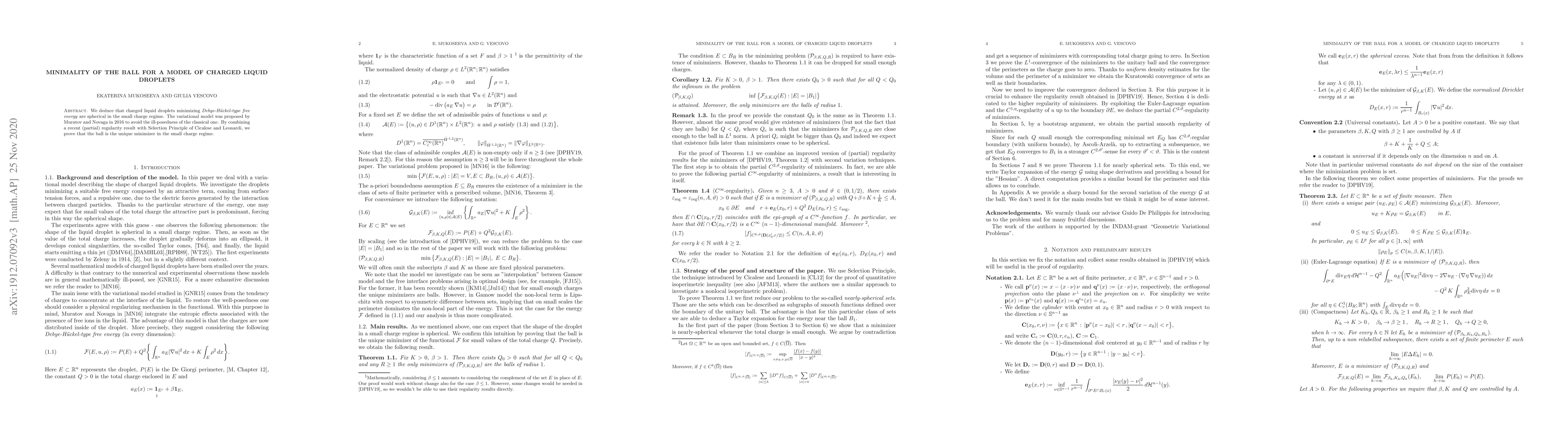 We deduce that charged liquid droplets minimizing Debye-H\"uckel-type free energy are spherical in the small charge regime. The variational model was proposed by Muratov and Novaga in 2016 to avoid the ill-posedness of the classical one. By combining a recent (partial) regularity result with Selection Principle of Cicalese and Leonardi, we prove that the ball is the unique minimizer in the small charge regime.