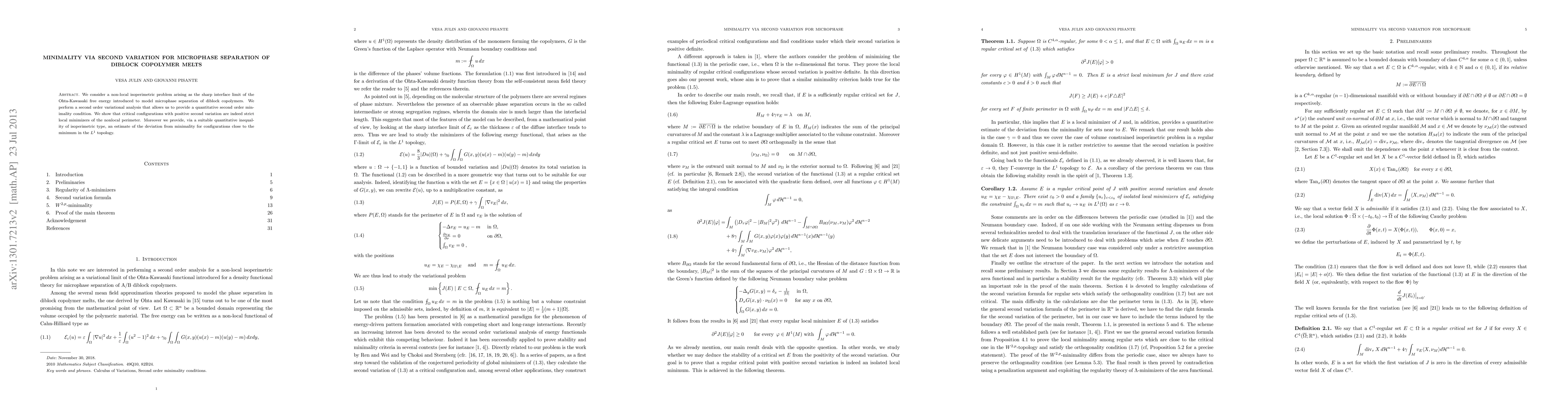 This paper investigates a nonlocal isoperimetric problem linked to the sharp interface limit of the Ohta-Kawasaki free energy for diblock copolymers. Through a second-order variational analysis, it establishes a quantitative minimality condition and proves that configurations with positive second variation are strict local minimizers, along with providing an $L^1$ estimate of deviation from minimality for nearby configurations.