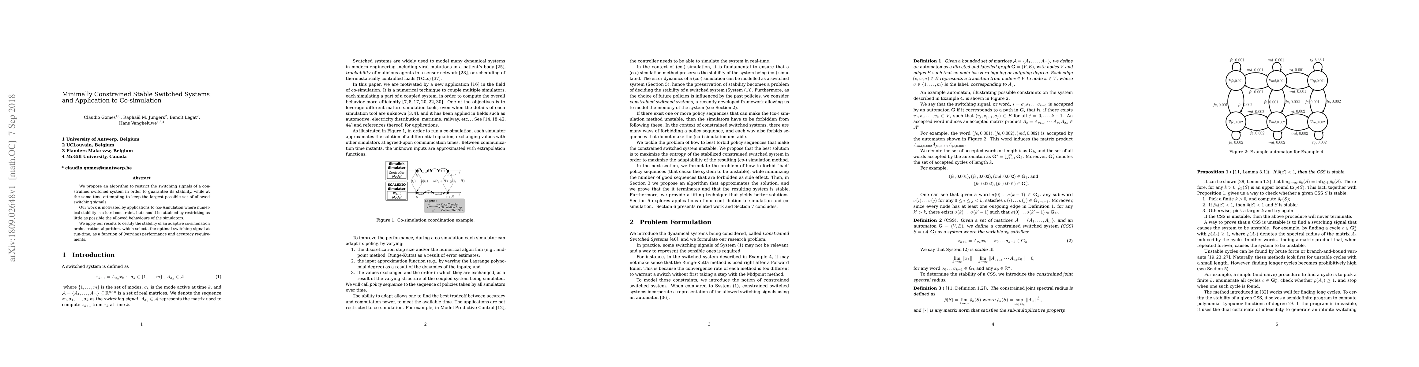 We propose an algorithm to restrict the switching signals of a constrained switched system in order to guarantee its stability, while at the same time attempting to keep the largest possible set of allowed switching signals. Our work is motivated by applications to (co-)simulation, where numerical stability is a hard constraint, but should be attained by restricting as little as possible the allowed behaviours of the simulators. We apply our results to certify the stability of an adaptive co-simulation orchestration algorithm, which selects the optimal switching signal at run-time, as a function of (varying) performance and accuracy requirements.