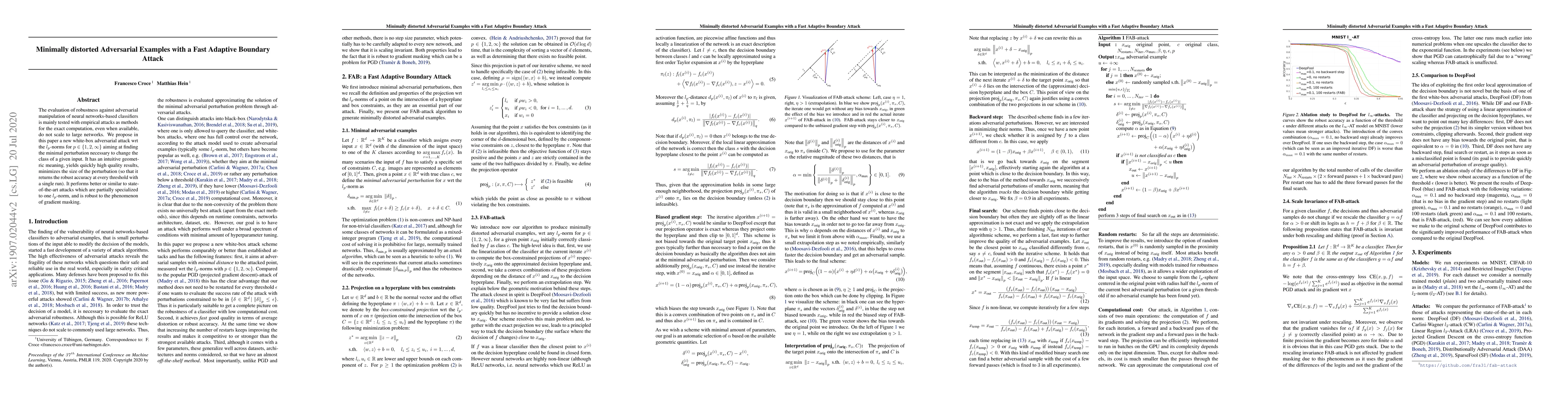 This paper introduces a new adaptive white-box attack method for generating minimal adversarial examples under $l_p$-norms, achieving high-quality results quickly and minimizing perturbation size. It outperforms or matches other state-of-the-art attacks and is resilient to gradient masking.