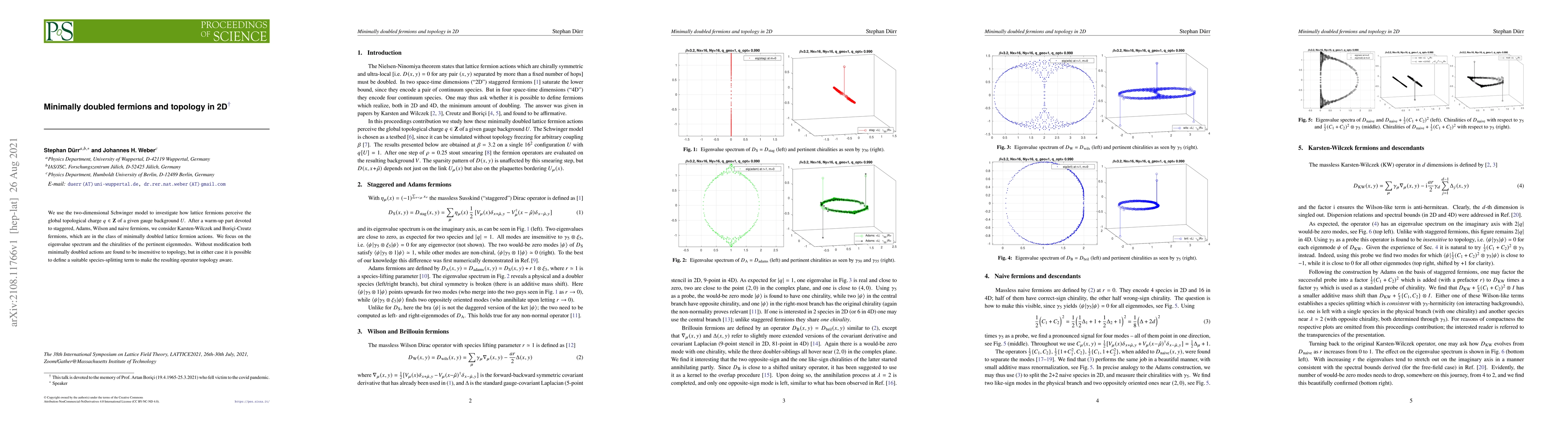 This paper explores the perception of global topological charge in the 2D Schwinger model using minimally doubled fermions, finding that standard actions are insensitive to topology but can be modified with a species-splitting term to become responsive. The study compares various fermion types, focusing on their eigenvalue spectra and chiralities.