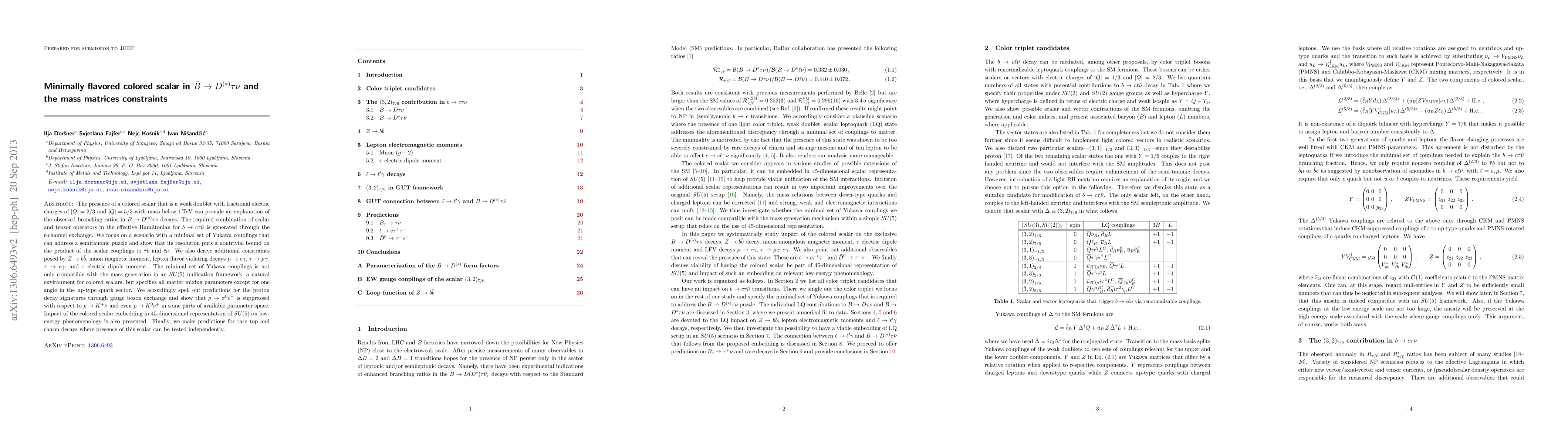 The presence of a colored scalar that is a weak doublet with fractional electric charges of $|Q|=2/3$ and $|Q|=5/3$ with mass below 1,TeV can provide an explanation of the observed branching ratios in $B \to D^{(*)} \tau \bar \nu$ decays. The required combination of scalar and tensor operators in the effective Hamiltonian for $b \to c \tau \bar \nu$ is generated through the $t$-channel exchange. We focus on a scenario with a minimal set of Yukawa couplings that can address a semitauonic puzzle and show that its resolution puts a nontrivial bound on the product of the scalar couplings to $\bar \tau b$ and $\bar c \nu$. We also derive additional constraints posed by $Z \to b\bar b$, muon magnetic moment, lepton flavor violating decays $\mu \to e \gamma$, $\tau \to \mu \gamma$, $\tau \to e \gamma$, and $\tau$ electric dipole moment. The minimal set of Yukawa couplings is not only compatible with the mass generation in an SU(5) unification framework, a natural environment for colored scalars, but specifies all matter mixing parameters except for one angle in the up-type quark sector. We accordingly spell out predictions for the proton decay signatures through gauge boson exchange and show that $p \rightarrow \pi^0 e^+$ is suppressed with respect to $p \rightarrow K^+ \bar{\nu}$ and even $p \rightarrow K^0 e^+$ in some parts of available parameter space. Impact of the colored scalar embedding in 45-dimensional representation of SU(5) on low-energy phenomenology is also presented. Finally, we make predictions for rare top and charm decays where presence of this scalar can be tested independently.
