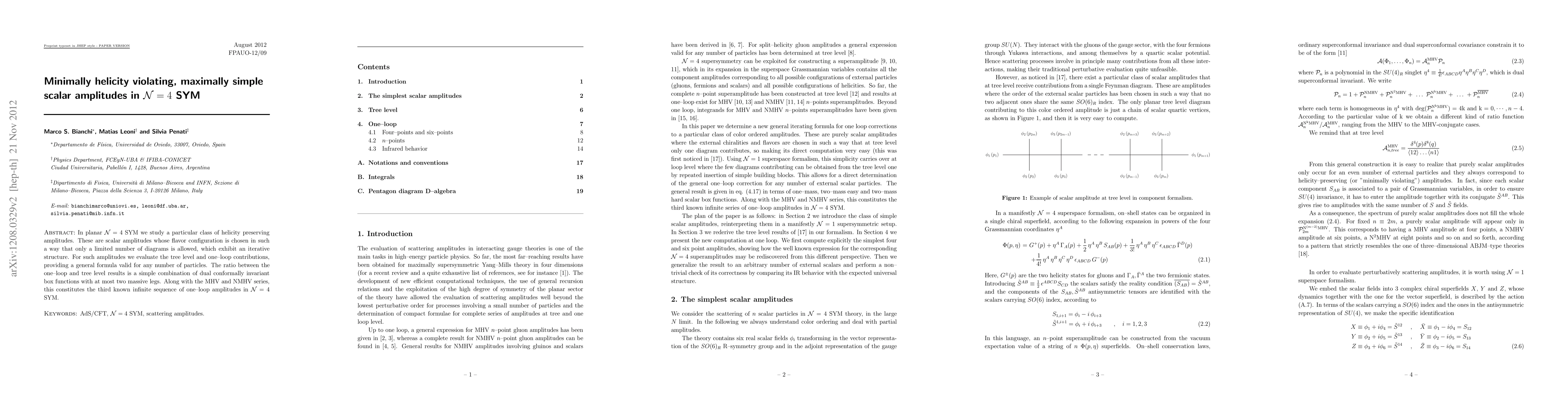 This paper investigates a specific class of helicity-preserving scalar amplitudes in planar N=4 SYM, revealing a limited number of allowed diagrams with an iterative structure. It provides tree-level and one-loop contributions, introducing a general formula for any number of particles, and identifies a simple combination of dual conformally invariant box functions for the one-loop to tree-level ratio.