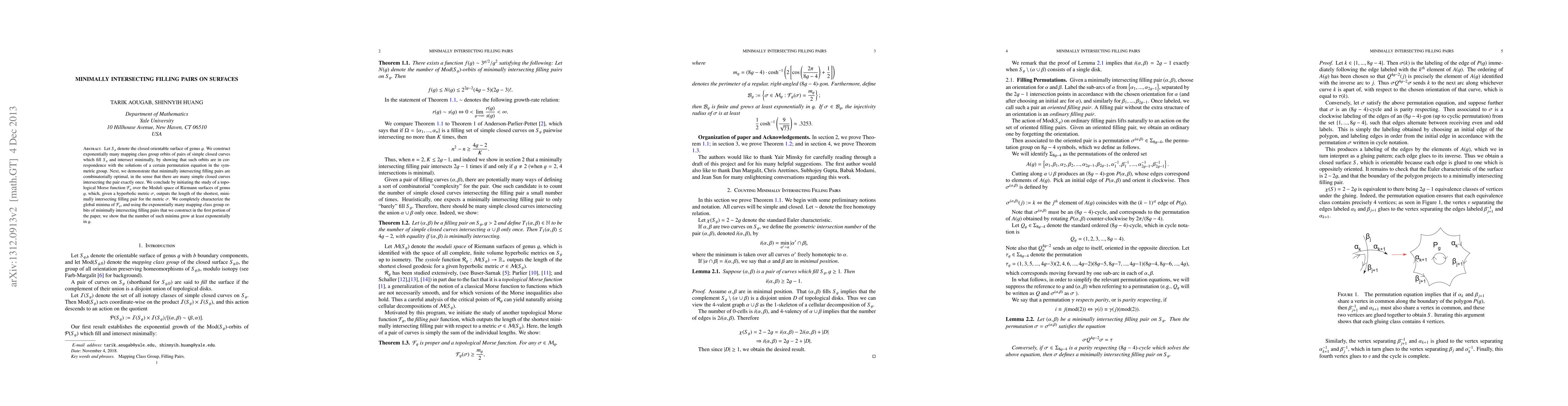 This paper constructs exponentially many mapping class group orbits of minimally intersecting filling pairs on closed orientable surfaces, establishing their combinatorial optimality. It introduces a topological Morse function over the Moduli space of Riemann surfaces, characterizing its global minima and proving their exponential growth with genus.