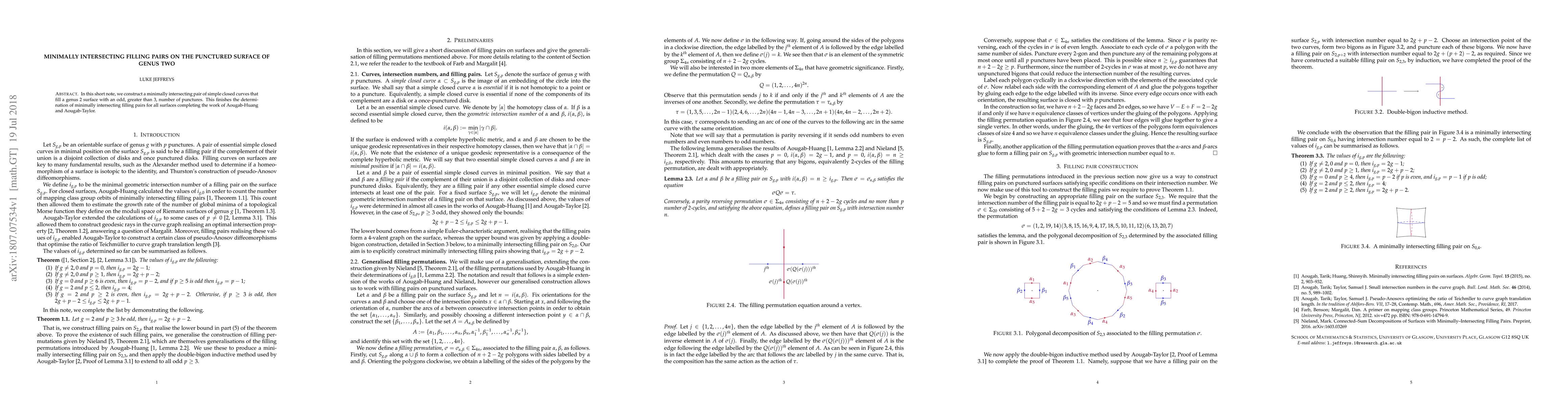 Summary: This paper presents a construction of a minimally intersecting pair of simple closed curves that fill a genus two surface with an odd number of punctures greater than three, completing the determination of such pairs for all surfaces. This work concludes the efforts initiated by Aougab-Huang and Aougab-Taylor.