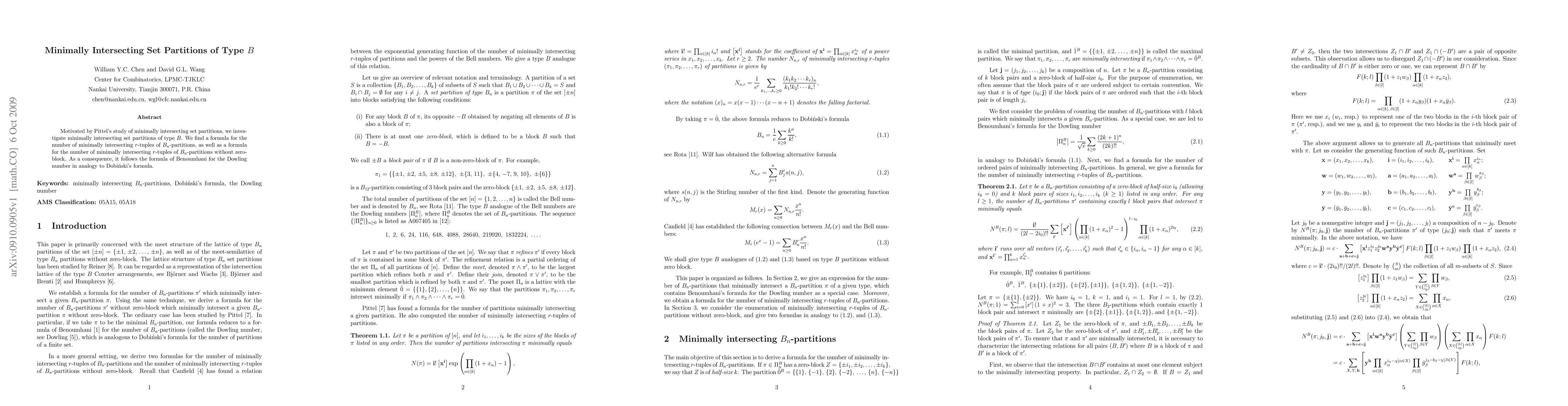 Motivated by Pittel's study of minimally intersecting set partitions, we investigate minimally intersecting set partitions of type B. We find a formula for the number of minimally intersecting r-tuples of $B_n$-partitions, as well as a formula for the number of minimally intersecting r-tuples of $B_n$-partitions without zero-block. As a consequence, it follows the formula of Benoumhani for the Dowling number in analogy to Dobinski's formula.