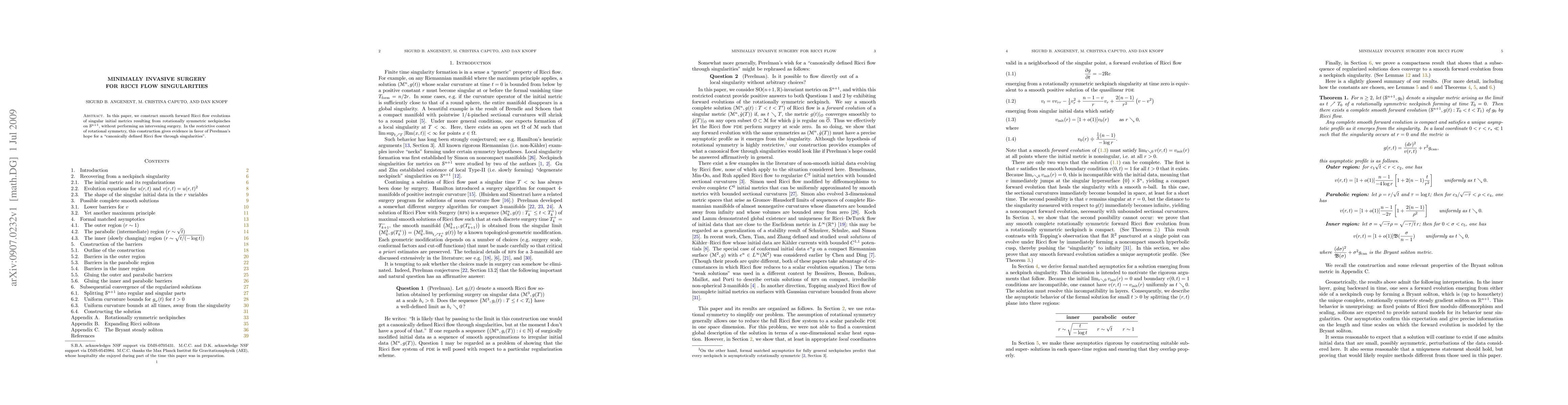 In this paper, we construct smooth forward Ricci flow evolutions of singular initial metrics resulting from rotationally symmetric neckpinches on S^(n+1), without performing an intervening surgery. In the restrictive context of rotational symmetry, this construction gives evidence in favor of Perelman's hope for a "canonically defined Ricci flow through singularities".