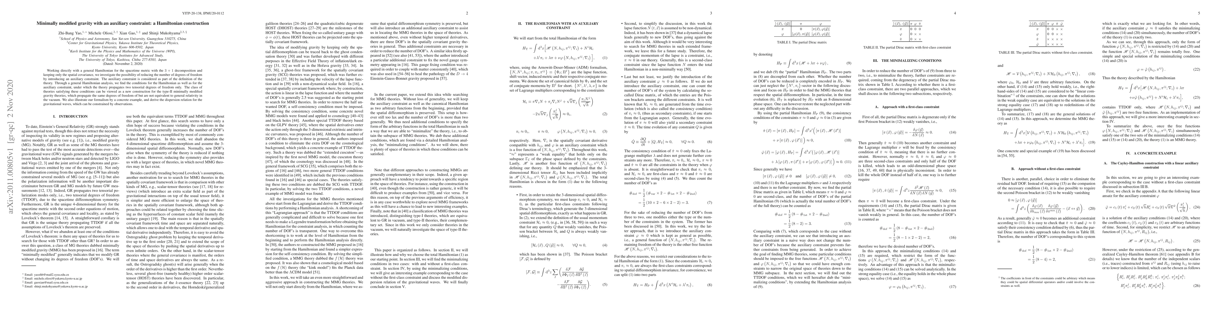 Working directly with a general Hamiltonian for the spacetime metric with the $3+1$ decomposition and keeping only the spatial covariance, we investigate the possibility of reducing the number of degrees of freedom by introducing an auxiliary constraint. The auxiliary constraint is considered as part of the definition of the theory. Through a general Hamiltonian analysis, we find the conditions for the Hamiltonian as well as for the auxiliary constraint, under which the theory propagates two tensorial degrees of freedom only. The class of theories satisfying these conditions can be viewed as a new construction for the type-II minimally modified gravity theories, which propagate the same degrees of freedom of but are not equivalent to general relativity in the vacuum. We also illustrate our formalism by a concrete example, and derive the dispersion relation for the gravitational waves, which can be constrained by observations.