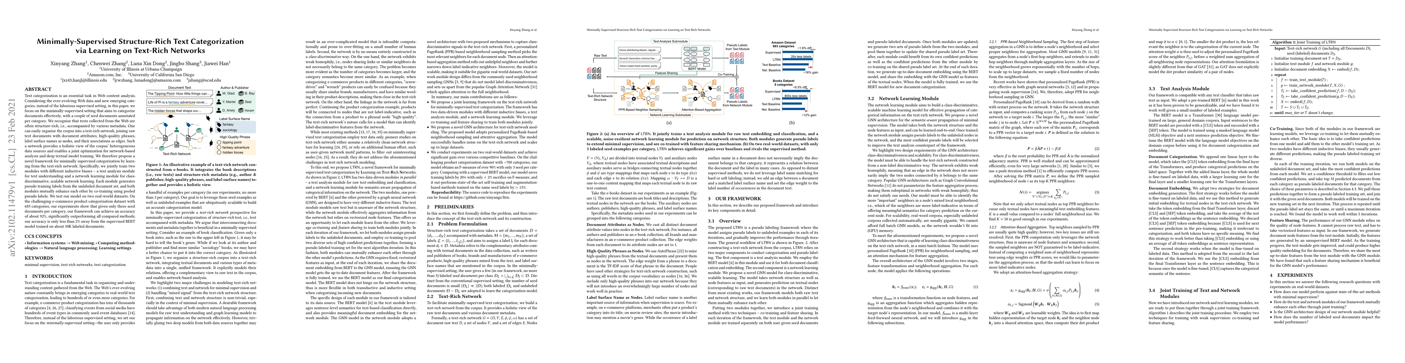 This paper proposes a minimally-supervised text categorization framework that leverages a text-rich network to effectively categorize documents with only a few seed annotations. The framework jointly trains text and network learning modules to generate pseudo labels, achieving high accuracy on e-commerce product categorization with minimal supervision.