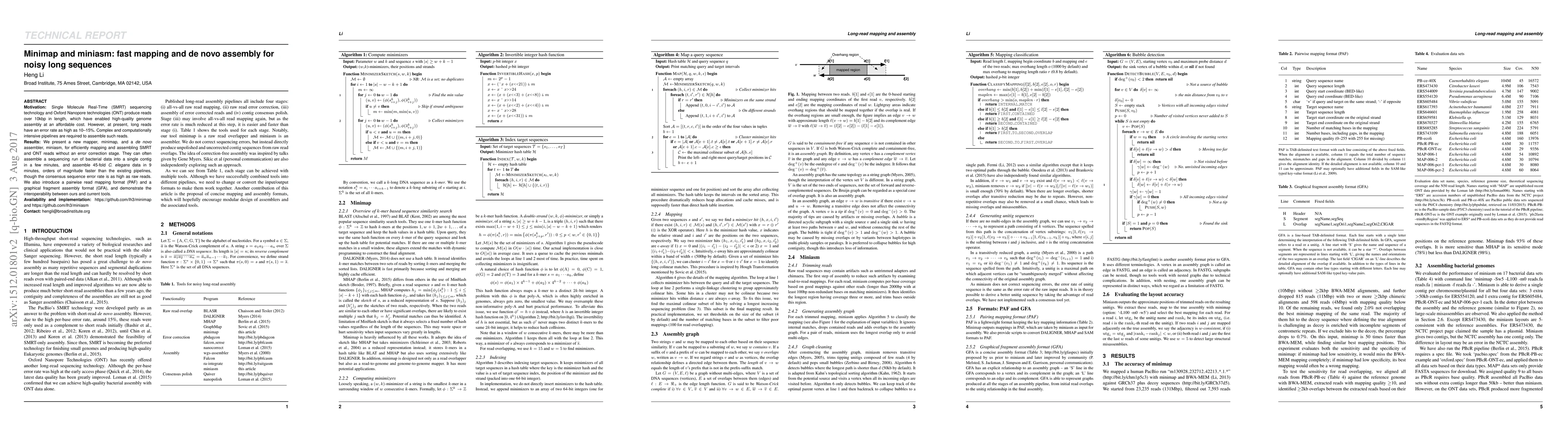 Motivation: Single Molecule Real-Time (SMRT) sequencing technology and Oxford Nanopore technologies (ONT) produce reads over 10kbp in length, which have enabled high-quality genome assembly at an affordable cost. However, at present, long reads have an error rate as high as 10-15%. Complex and computationally intensive pipelines are required to assemble such reads. Results: We present a new mapper, minimap, and a de novo assembler, miniasm, for efficiently mapping and assembling SMRT and ONT reads without an error correction stage. They can often assemble a sequencing run of bacterial data into a single contig in a few minutes, and assemble 45-fold C. elegans data in 9 minutes, orders of magnitude faster than the existing pipelines. We also introduce a pairwise read mapping format (PAF) and a graphical fragment assembly format (GFA), and demonstrate the interoperability between ours and current tools. Availability and implementation: https://github.com/lh3/minimap and https://github.com/lh3/miniasm Contact: [email protected]