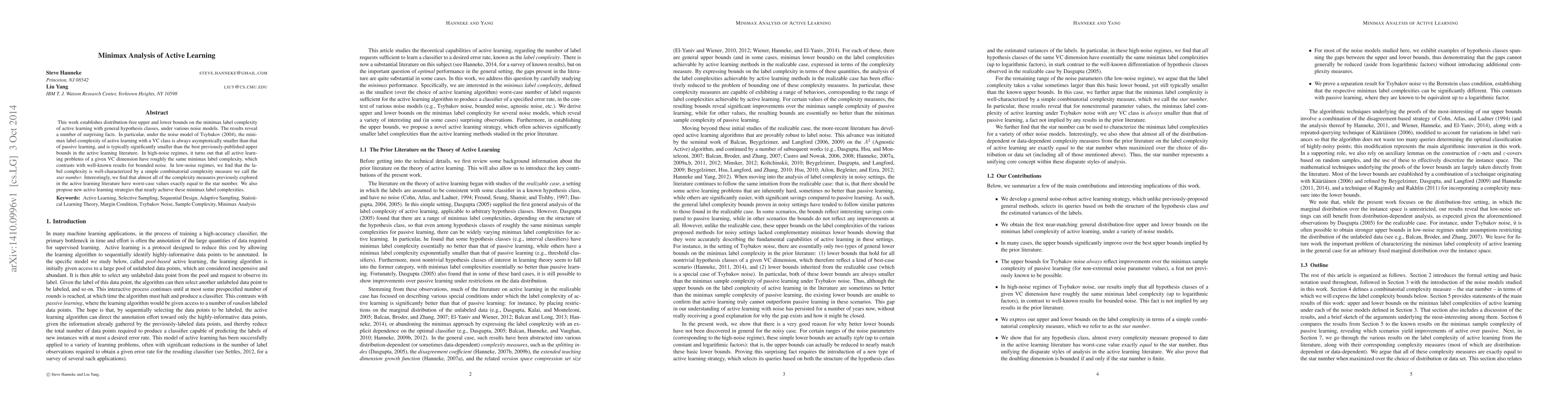 This work establishes distribution-free upper and lower bounds on the minimax label complexity of active learning with general hypothesis classes, under various noise models. The results reveal a number of surprising facts. In particular, under the noise model of Tsybakov (2004), the minimax label complexity of active learning with a VC class is always asymptotically smaller than that of passive learning, and is typically significantly smaller than the best previously-published upper bounds in the active learning literature. In high-noise regimes, it turns out that all active learning problems of a given VC dimension have roughly the same minimax label complexity, which contrasts with well-known results for bounded noise. In low-noise regimes, we find that the label complexity is well-characterized by a simple combinatorial complexity measure we call the star number. Interestingly, we find that almost all of the complexity measures previously explored in the active learning literature have worst-case values exactly equal to the star number. We also propose new active learning strategies that nearly achieve these minimax label complexities.