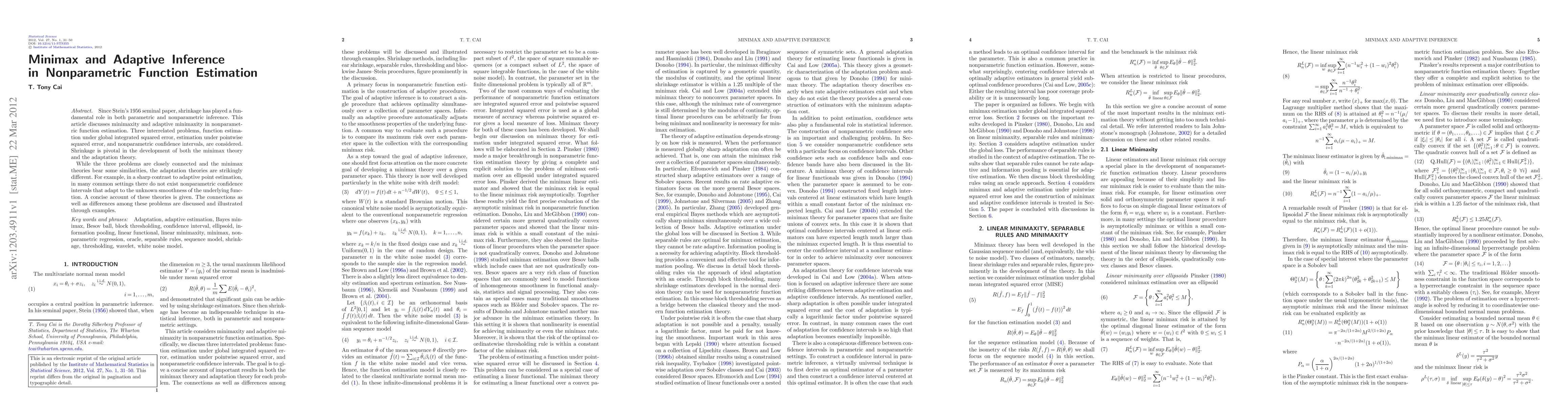 This paper explores minimax and adaptive inference in nonparametric function estimation, focusing on shrinkage techniques. It examines three problems: global and pointwise error estimation, and nonparametric confidence intervals, highlighting the differences in adaptation theory despite similarities in minimax theory.