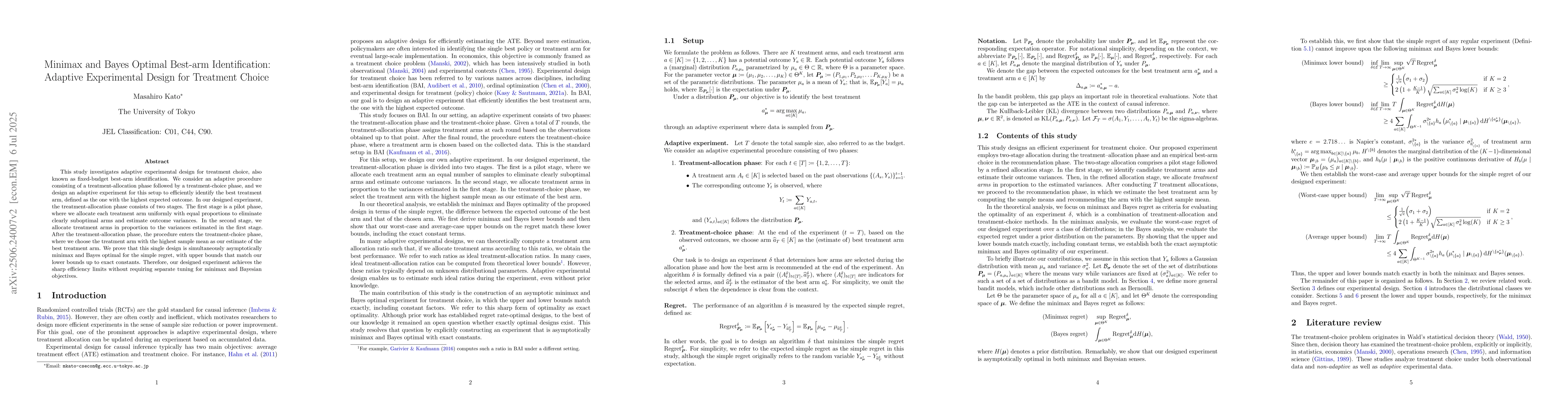 This study investigates adaptive experimental design for treatment choice, also known as fixed-budget best-arm identification. We consider an adaptive procedure consisting of a treatment-allocation phase followed by a treatment-choice phase, and we design an adaptive experiment for this setup to efficiently identify the best treatment arm, defined as the one with the highest expected outcome. In our designed experiment, the treatment-allocation phase consists of two stages. The first stage is a pilot phase, where we allocate each treatment arm uniformly with equal proportions to eliminate clearly suboptimal arms and estimate outcome variances. In the second stage, we allocate treatment arms in proportion to the variances estimated in the first stage. After the treatment-allocation phase, the procedure enters the treatment-choice phase, where we choose the treatment arm with the highest sample mean as our estimate of the best treatment arm. We prove that this single design is simultaneously asymptotically minimax and Bayes optimal for the simple regret, with upper bounds that match our lower bounds up to exact constants. Therefore, our designed experiment achieves the sharp efficiency limits without requiring separate tuning for minimax and Bayesian objectives.