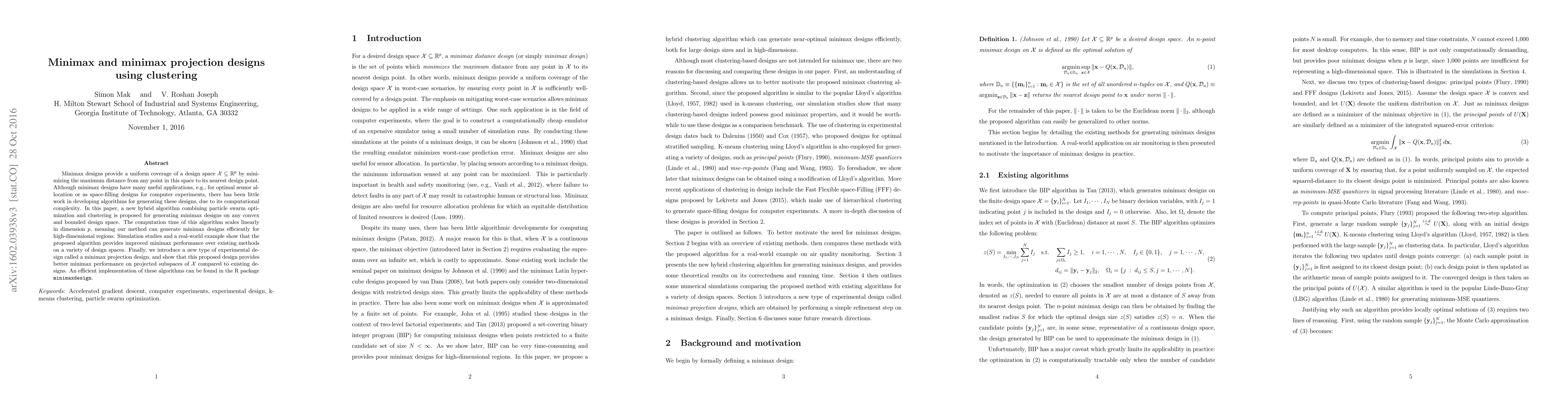 This paper proposes a hybrid algorithm combining particle swarm optimization and clustering to generate minimax designs efficiently, scaling linearly with dimension. The new method outperforms existing approaches in simulations and real-world examples, and introduces minimax projection designs for better performance in subspaces.