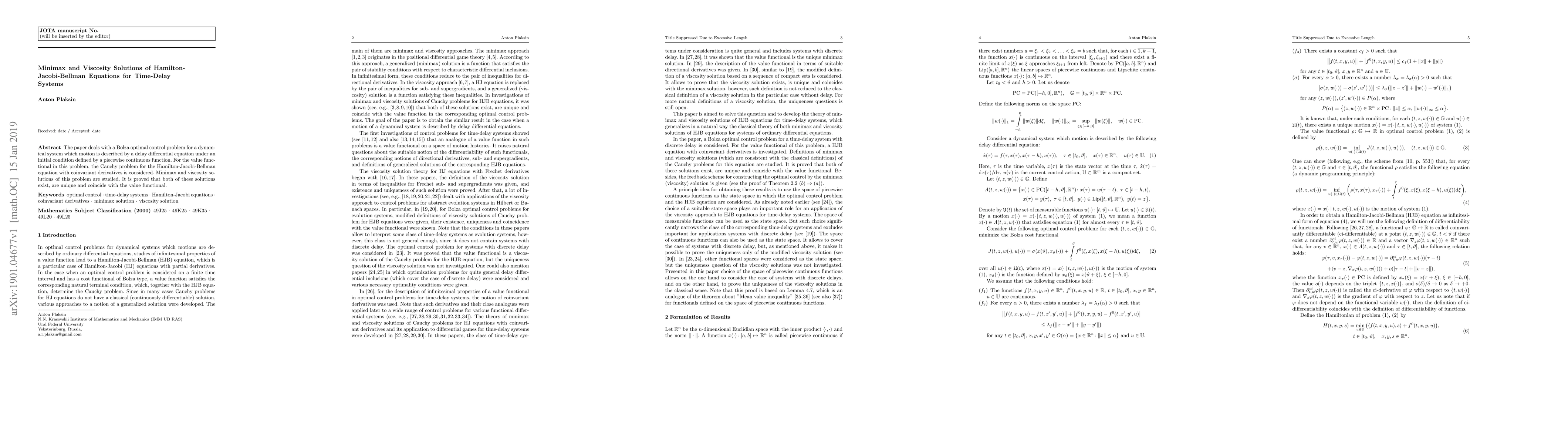 This paper investigates the existence and uniqueness of minimax and viscosity solutions for the Hamilton-Jacobi-Bellman equation associated with a Bolza optimal control problem for time-delay systems. It proves that both solution types exist, are unique, and coincide with the value functional.