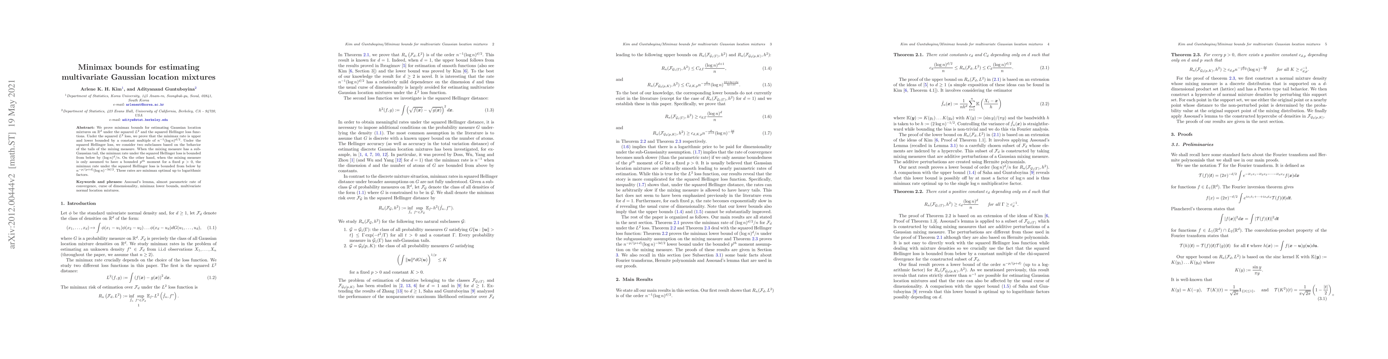 Researchers established minimax bounds for estimating multivariate Gaussian location mixtures, showing that certain rates of convergence are achievable under squared L2 and squared Hellinger loss functions.