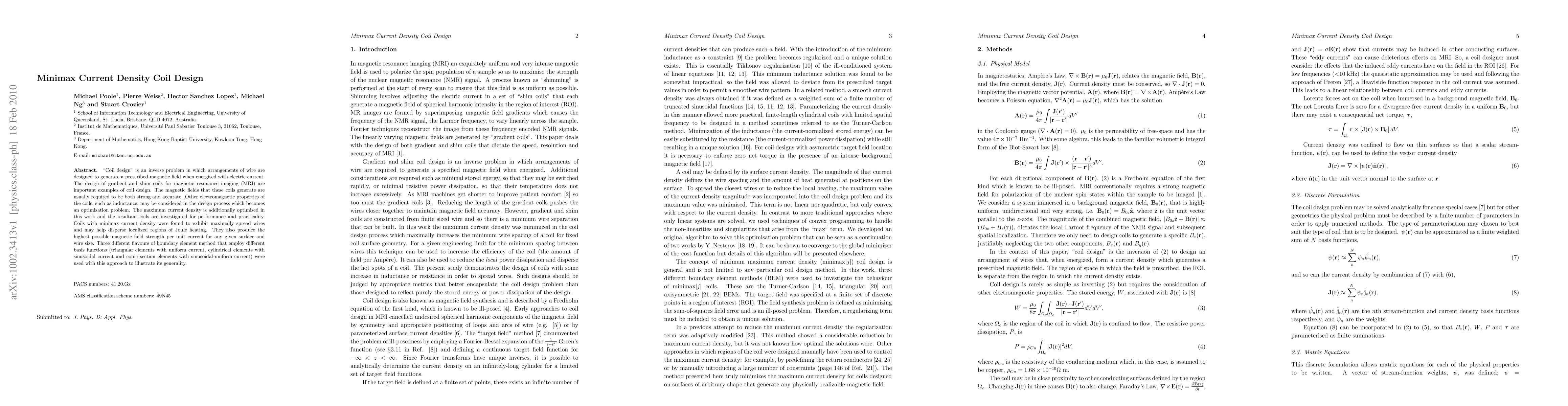 This paper presents a minimax current density approach for optimizing coil design in MRI, focusing on generating strong and accurate magnetic fields while minimizing localized Joule heating. The study employs three boundary element methods to demonstrate the effectiveness of coils with maximally spread wires in achieving high magnetic field strength per unit current.