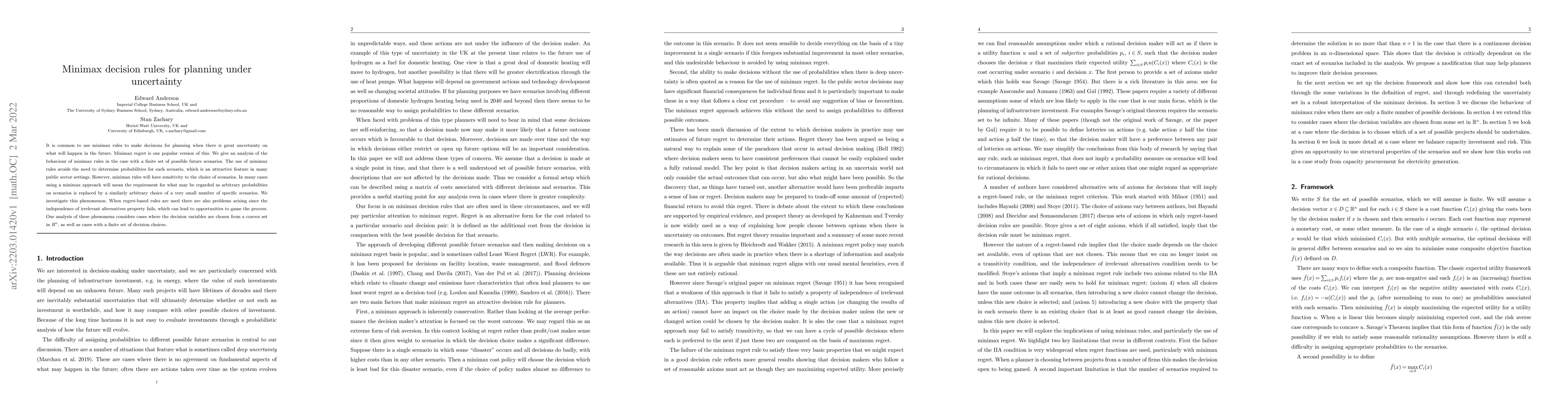 This paper analyzes minimax decision rules for planning under uncertainty, particularly with finite future scenarios. It highlights that while minimax rules avoid assigning probabilities to scenarios, they are sensitive to scenario choice, often necessitating arbitrary selections. The study also reveals issues with regret-based rules, such as the failure of the independence of irrelevant alternatives property, potentially enabling manipulation. The analysis covers decision variables from convex sets in $R^n$ and finite decision choices.