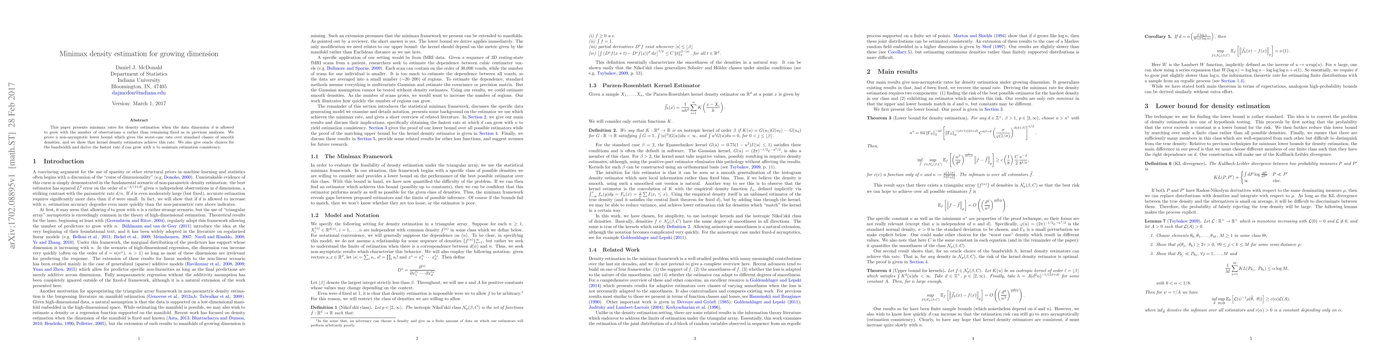 This paper presents minimax rates for density estimation when the data dimension $d$ is allowed to grow with the number of observations $n$ rather than remaining fixed as in previous analyses. We prove a non-asymptotic lower bound which gives the worst-case rate over standard classes of smooth densities, and we show that kernel density estimators achieve this rate. We also give oracle choices for the bandwidth and derive the fastest rate $d$ can grow with $n$ to maintain estimation consistency.