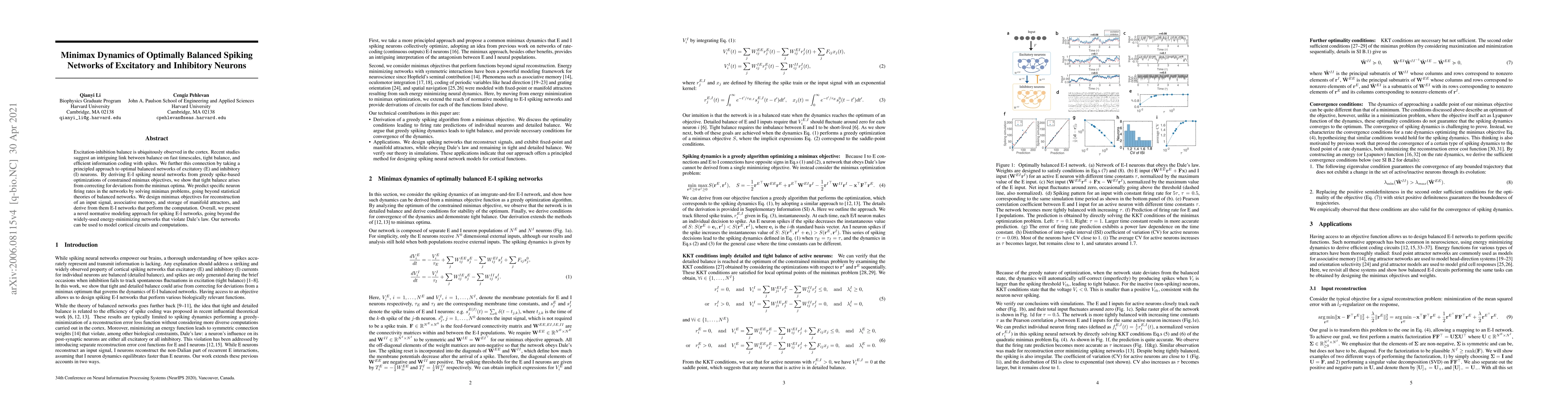 This paper proposes a novel normative modeling approach for optimally balanced spiking networks of excitatory and inhibitory neurons, deriving networks from minimax optimizations that correct for deviations from balance. It predicts specific neuron firing rates and designs minimax objectives for signal reconstruction, memory, and attractor storage, offering a framework that adheres to Dale's law.