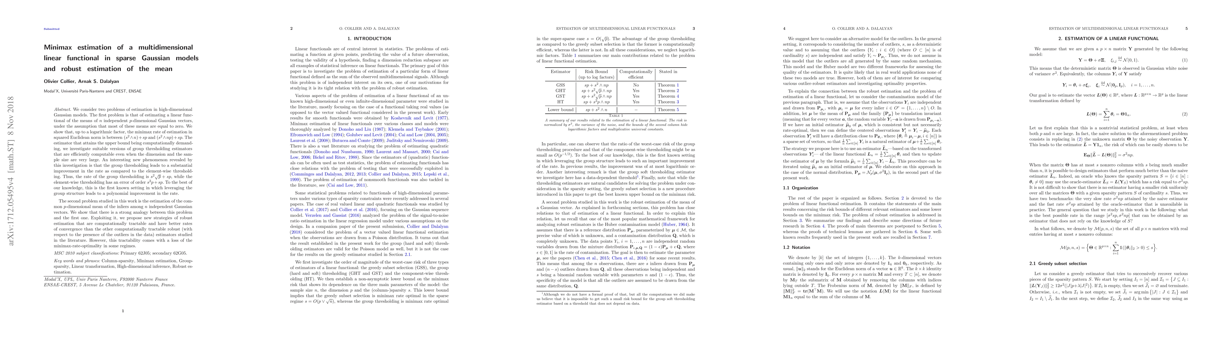 We consider two problems of estimation in high-dimensional Gaussian models. The first problem is that of estimating a linear functional of the means of $n$ independent $p$-dimensional Gaussian vectors, under the assumption that most of these means are equal to zero. We show that, up to a logarithmic factor, the minimax rate of estimation in squared Euclidean norm is between $(s^2\wedge n) +sp$ and $(s^2\wedge np)+sp$. The estimator that attains the upper bound being computationally demanding, we investigate suitable versions of group thresholding estimators that are efficiently computable even when the dimension and the sample size are very large. An interesting new phenomenon revealed by this investigation is that the group thresholding leads to a substantial improvement in the rate as compared to the element-wise thresholding. Thus, the rate of the group thresholding is $s^2\sqrt{p}+sp$, while the element-wise thresholding has an error of order $s^2p+sp$. To the best of our knowledge, this is the first known setting in which leveraging the group structure leads to a polynomial improvement in the rate. The second problem studied in this work is the estimation of the common $p$-dimensional mean of the inliers among $n$ independent Gaussian vectors. We show that there is a strong analogy between this problem and the first one. Exploiting it, we propose new strategies of robust estimation that are computationally tractable and have better rates of convergence than the other computationally tractable robust (with respect to the presence of the outliers in the data) estimators studied in the literature. However, this tractability comes with a loss of the minimax-rate-optimality in some regimes.
