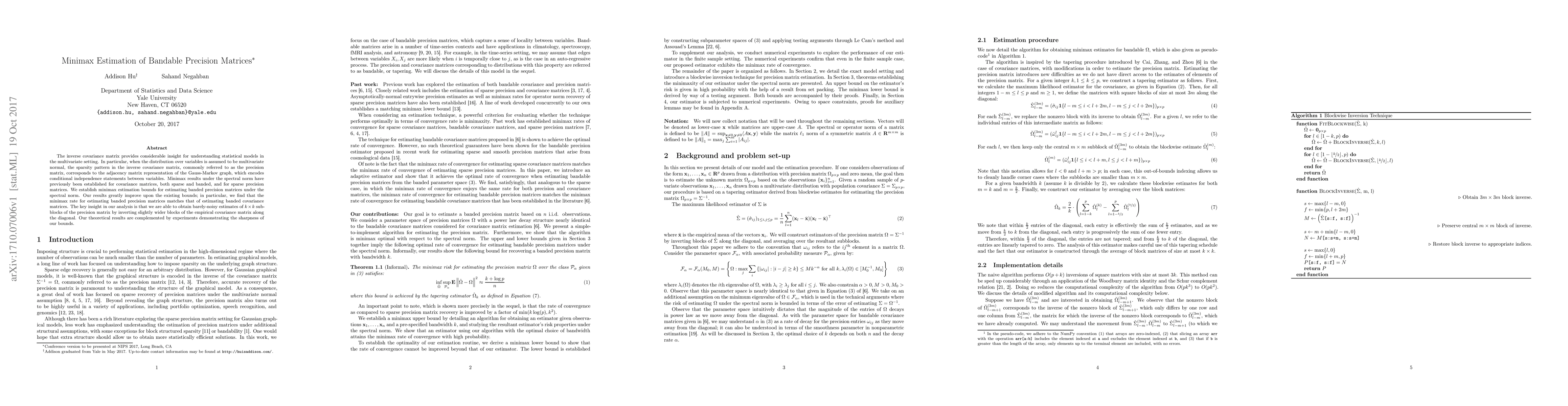 This paper establishes minimax estimation bounds for banded precision matrices under the spectral norm, improving upon existing results. The key insight is obtaining accurate estimates of subblocks by inverting slightly wider blocks of the empirical covariance matrix, matching the minimax rate for banded covariance matrices.