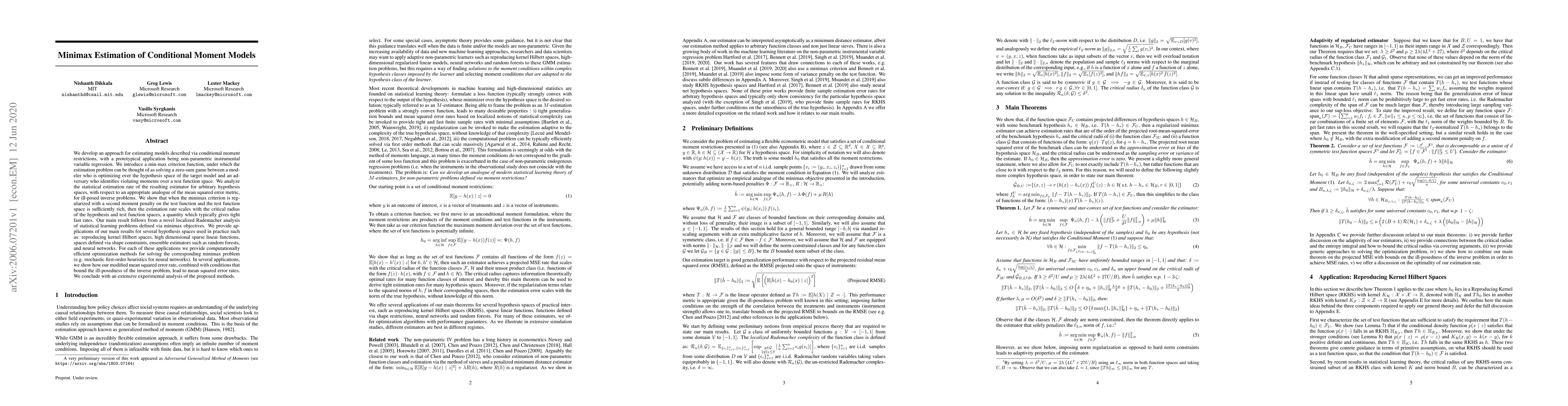 We develop an approach for estimating models described via conditional moment restrictions, with a prototypical application being non-parametric instrumental variable regression. We introduce a min-max criterion function, under which the estimation problem can be thought of as solving a zero-sum game between a modeler who is optimizing over the hypothesis space of the target model and an adversary who identifies violating moments over a test function space. We analyze the statistical estimation rate of the resulting estimator for arbitrary hypothesis spaces, with respect to an appropriate analogue of the mean squared error metric, for ill-posed inverse problems. We show that when the minimax criterion is regularized with a second moment penalty on the test function and the test function space is sufficiently rich, then the estimation rate scales with the critical radius of the hypothesis and test function spaces, a quantity which typically gives tight fast rates. Our main result follows from a novel localized Rademacher analysis of statistical learning problems defined via minimax objectives. We provide applications of our main results for several hypothesis spaces used in practice such as: reproducing kernel Hilbert spaces, high dimensional sparse linear functions, spaces defined via shape constraints, ensemble estimators such as random forests, and neural networks. For each of these applications we provide computationally efficient optimization methods for solving the corresponding minimax problem (e.g. stochastic first-order heuristics for neural networks). In several applications, we show how our modified mean squared error rate, combined with conditions that bound the ill-posedness of the inverse problem, lead to mean squared error rates. We conclude with an extensive experimental analysis of the proposed methods.