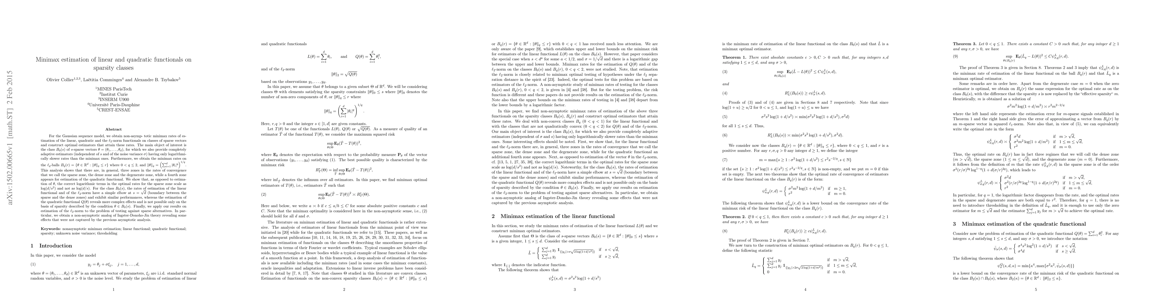 This paper presents non-asymptotic minimax rates for estimating linear, quadratic functionals, and the L2-norm on sparse vector classes under Gaussian sequence models. It constructs optimal estimators and identifies four convergence zones, with distinct scaling behaviors for sparse versus dense zones.