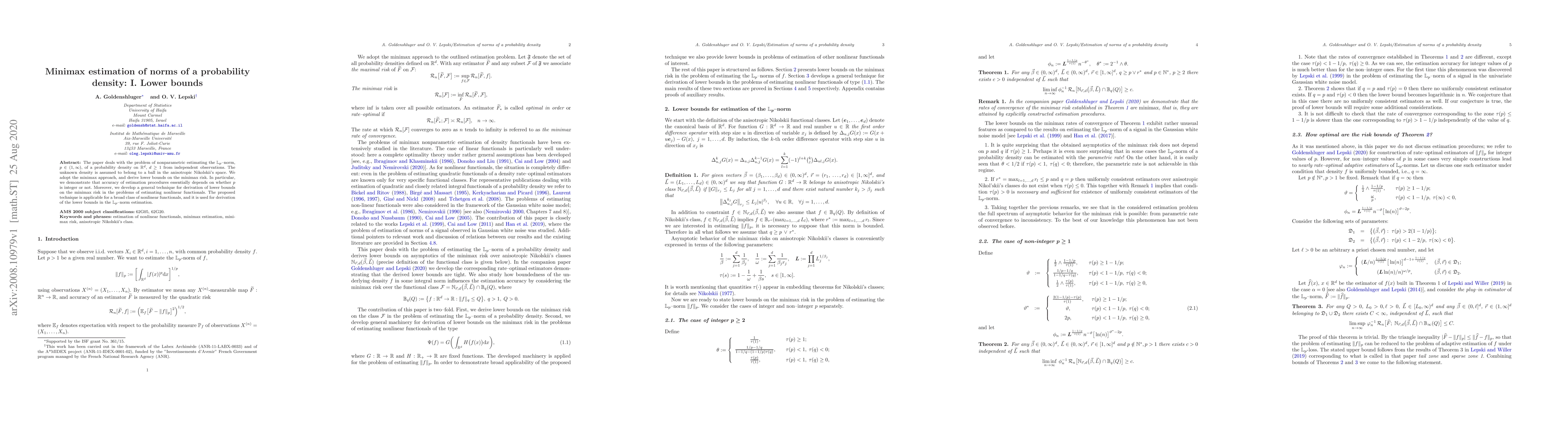 The paper deals with the problem of nonparametric estimating the $L_p$--norm, $p\in (1,\infty)$, of a probability density on $R^d$, $d\geq 1$ from independent observations. The unknown density %to be estimated is assumed to belong to a ball in the anisotropic Nikolskii's space. We adopt the minimax approach, and derive lower bounds on the minimax risk. In particular, we demonstrate that accuracy of estimation procedures essentially depends on whether $p$ is integer or not. Moreover, we develop a general technique for derivation of lower bounds on the minimax risk in the problems of estimating nonlinear functionals. The proposed technique is applicable for a broad class of nonlinear functionals, and it is used for derivation of the lower bounds in the~$L_p$--norm estimation.