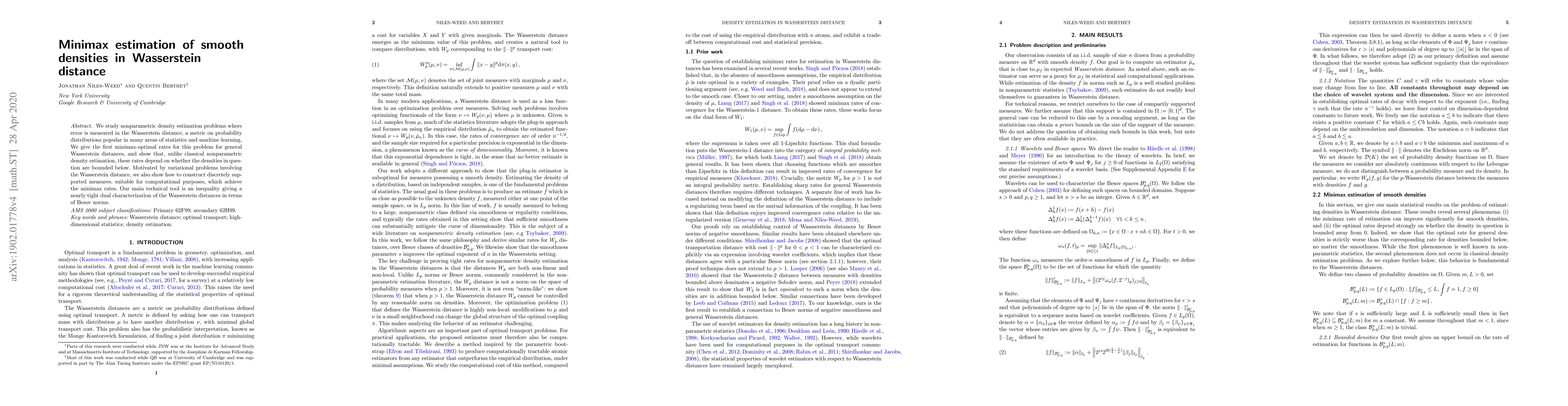 This paper presents the first minimax-optimal rates for nonparametric density estimation using Wasserstein distance, revealing that optimal rates depend on whether densities are bounded below. It also constructs computationally feasible discrete measures achieving these rates, leveraging a dual characterization of Wasserstein distances via Besov norms.