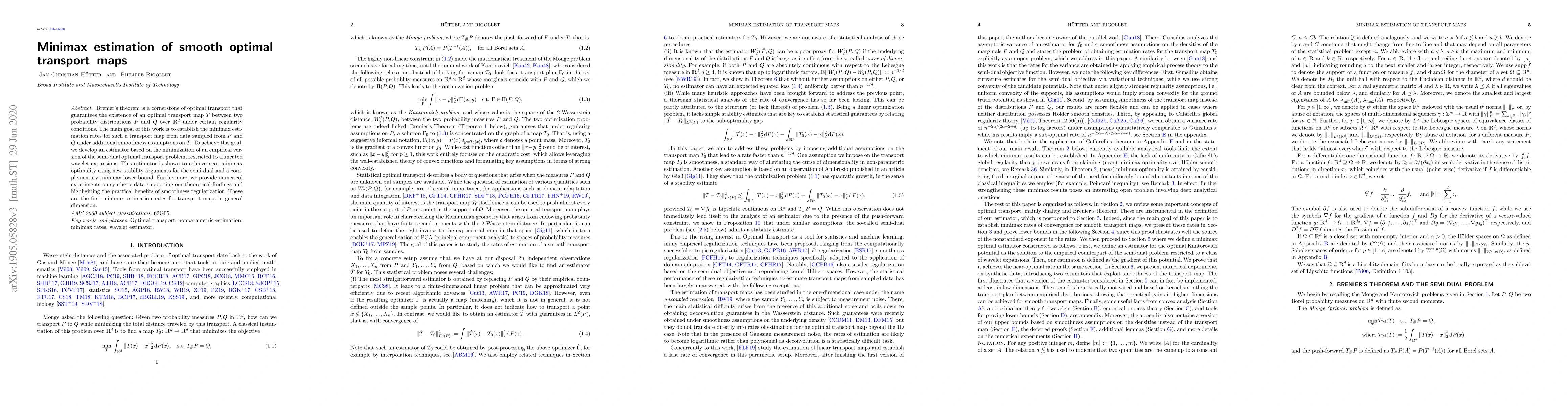 This paper establishes minimax estimation rates for smooth optimal transport maps between two probability distributions, developing a wavelet-based estimator that achieves near minimax optimality. The work provides theoretical guarantees and supports findings with numerical experiments on synthetic data.