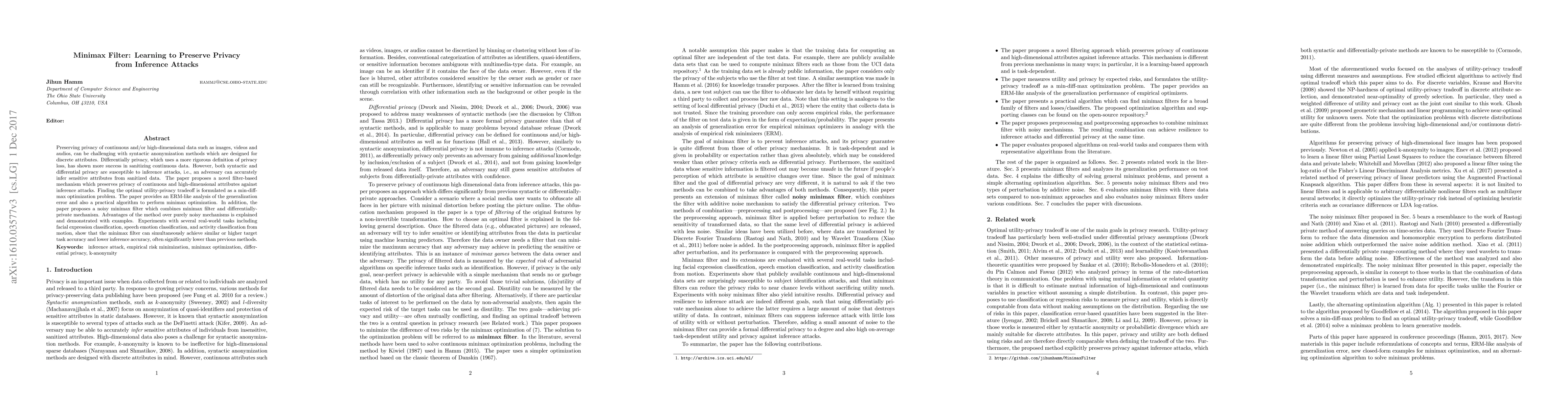 Preserving privacy of continuous and/or high-dimensional data such as images, videos and audios, can be challenging with syntactic anonymization methods which are designed for discrete attributes. Differential privacy, which provides a more formal definition of privacy, has shown more success in sanitizing continuous data. However, both syntactic and differential privacy are susceptible to inference attacks, i.e., an adversary can accurately infer sensitive attributes from sanitized data. The paper proposes a novel filter-based mechanism which preserves privacy of continuous and high-dimensional attributes against inference attacks. Finding the optimal utility-privacy tradeoff is formulated as a min-diff-max optimization problem. The paper provides an ERM-like analysis of the generalization error and also a practical algorithm to perform the optimization. In addition, the paper proposes an extension that combines minimax filter and differentially-private noisy mechanism. Advantages of the method over purely noisy mechanisms is explained and demonstrated with examples. Experiments with several real-world tasks including facial expression classification, speech emotion classification, and activity classification from motion, show that the minimax filter can simultaneously achieve similar or better target task accuracy and lower inference accuracy, often significantly lower than previous methods.