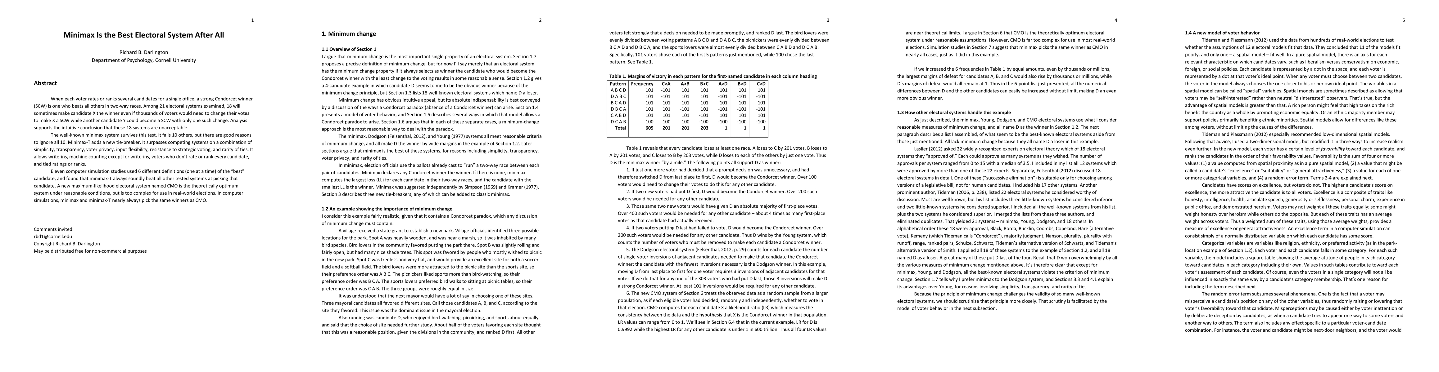 When each voter rates or ranks several candidates for a single office, a strong Condorcet winner (SCW) is one who beats all others in two-way races. Among 21 electoral systems examined, 18 will sometimes make candidate X the winner even if thousands of voters would need to change their votes to make X a SCW while another candidate Y could become a SCW with only one such change. Analysis supports the intuitive conclusion that these 18 systems are unacceptable. The well-known minimax system survives this test. It fails 10 others, but there are good reasons to ignore all 10. Minimax-T adds a new tie-breaker. It surpasses competing systems on a combination of simplicity, transparency, voter privacy, input flexibility, resistance to strategic voting, and rarity of ties. It allows write-ins, machine counting except for write-ins, voters who don't rate or rank every candidate, and tied ratings or ranks. Eleven computer simulation studies used 6 different definitions (one at a time) of the best candidate, and found that minimax-T always soundly beat all other tested systems at picking that candidate. A new maximum-likelihood electoral system named CMO is the theoretically optimum system under reasonable conditions, but is too complex for use in real-world elections. In computer simulations, minimax and minimax-T nearly always pick the same winners as CMO.