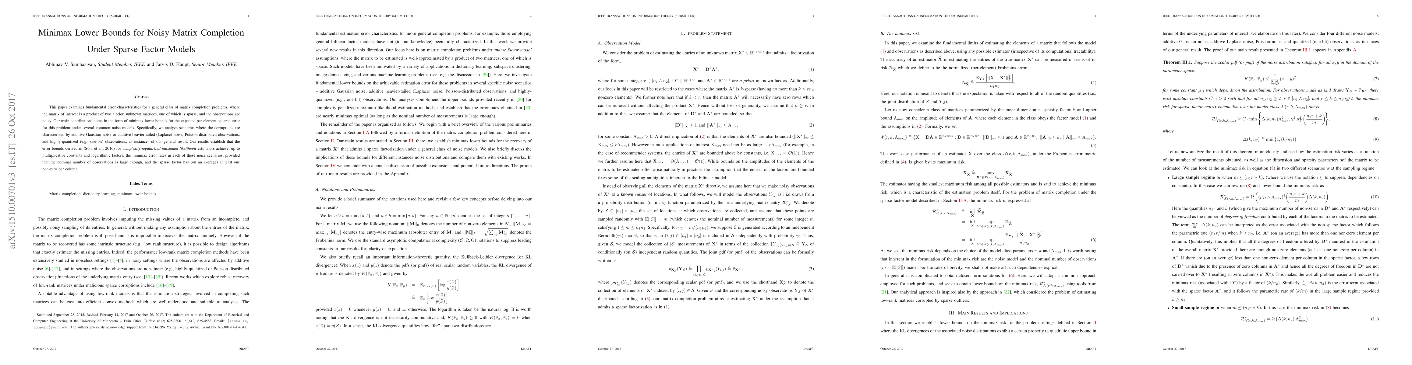 This paper establishes minimax lower bounds for noisy matrix completion under sparse factor models, showing that the error rates derived for complexity-regularized maximum likelihood estimators are optimal, up to constants and logarithmic factors, across various noise models including Gaussian, Laplace, Poisson, and one-bit quantization.