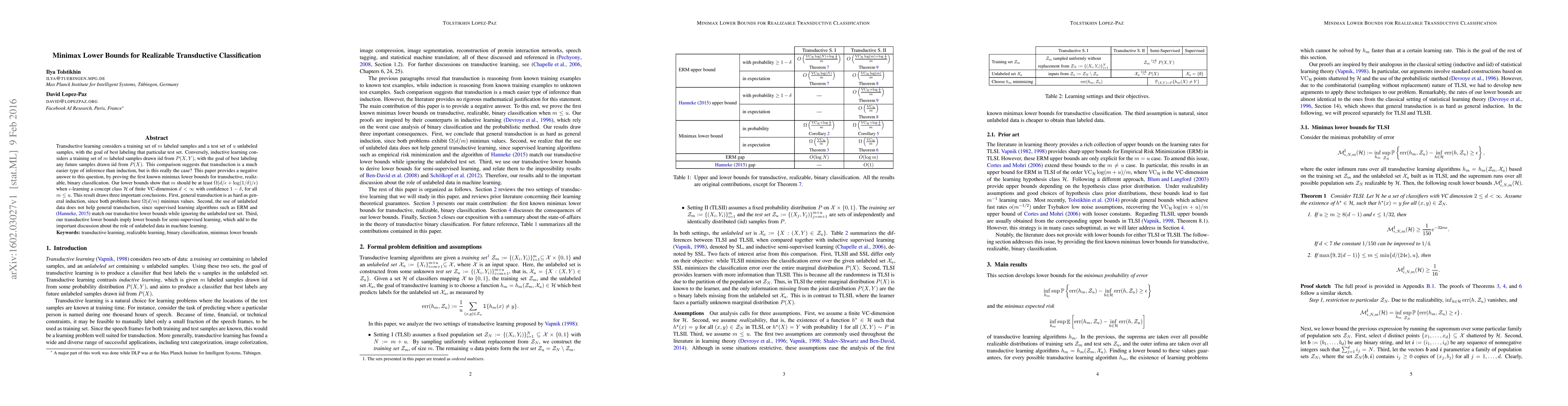 This paper establishes the first minimax lower bounds for realizable transductive binary classification, demonstrating that transductive learning is as challenging as inductive learning. The findings show that sufficient labeled data is necessary to achieve $\epsilon$-learning with a certain confidence level, highlighting the limited benefit of unlabeled data in this context.