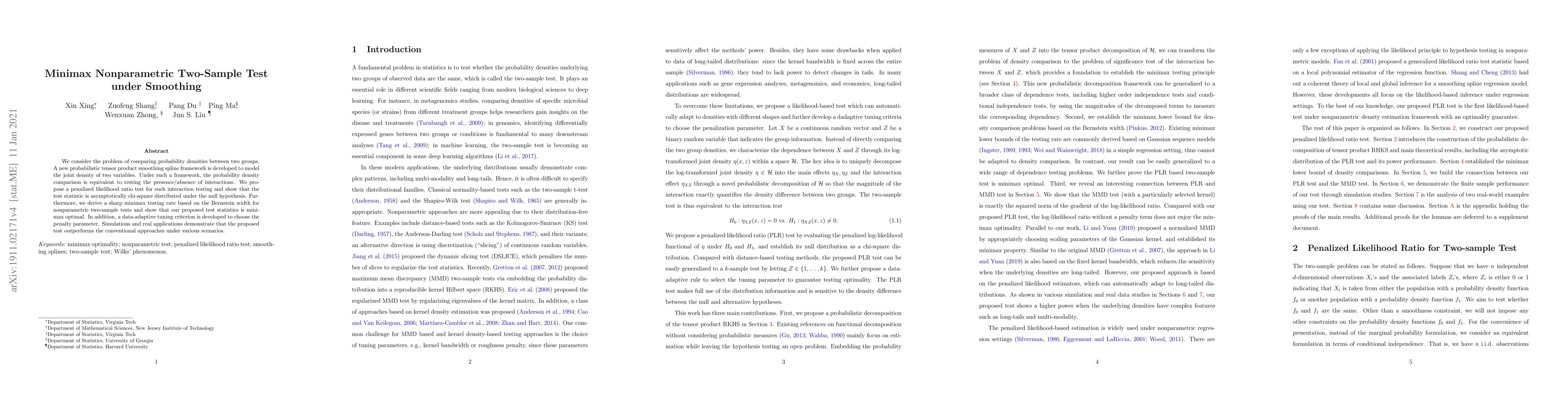 We consider the problem of comparing probability densities between two groups. A new probabilistic tensor product smoothing spline framework is developed to model the joint density of two variables. Under such a framework, the probability density comparison is equivalent to testing the presence/absence of interactions. We propose a penalized likelihood ratio test for such interaction testing and show that the test statistic is asymptotically chi-square distributed under the null hypothesis. Furthermore, we derive a sharp minimax testing rate based on the Bernstein width for nonparametric two-sample tests and show that our proposed test statistics is minimax optimal. In addition, a data-adaptive tuning criterion is developed to choose the penalty parameter. Simulations and real applications demonstrate that the proposed test outperforms the conventional approaches under various scenarios.