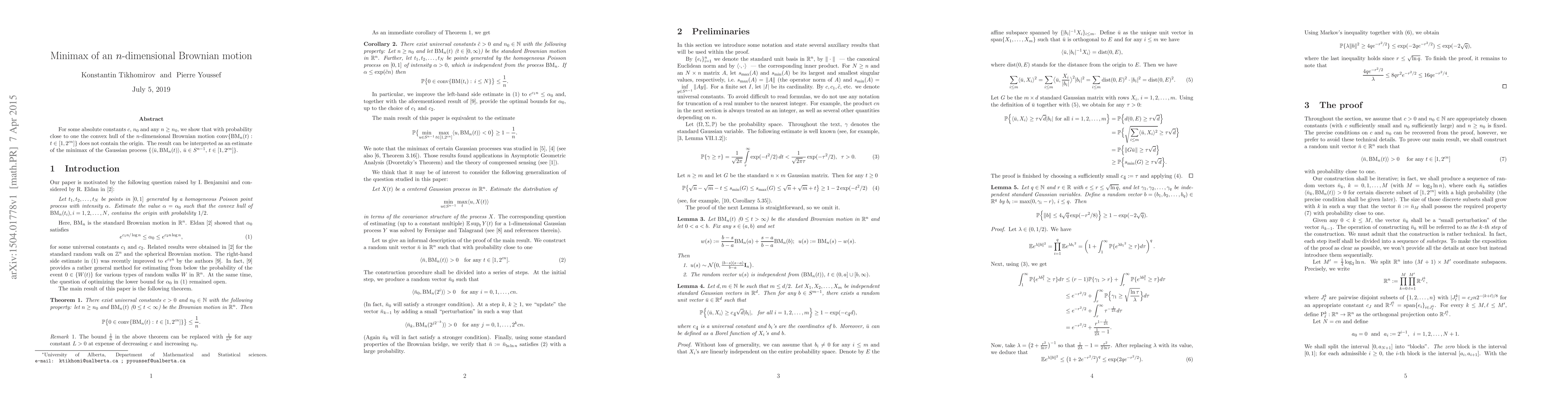 This paper demonstrates that for sufficiently large dimensions $n$, the convex hull of an $n$-dimensional Brownian motion over $[1, 2^{cn}]$ almost certainly does not contain the origin. This finding provides an estimate for the minimax of the Gaussian process associated with the Brownian motion.