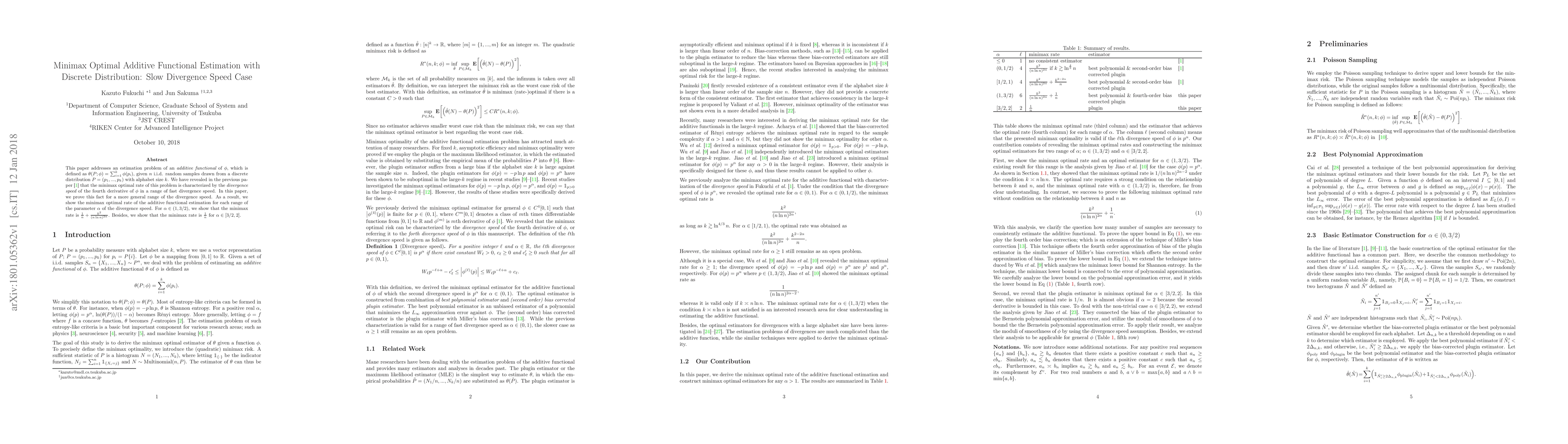 This paper investigates the estimation of an additive functional of $\phi$ from discrete distribution samples, revealing the minimax optimal rate for different divergence speed ranges. For $\alpha \in (1,3/2)$, the optimal rate is $\frac{1}{n}+\frac{k^2}{(n\ln n)^{2\alpha}}$, while for $\alpha \in [3/2,2]$, it simplifies to $\frac{1}{n}$.