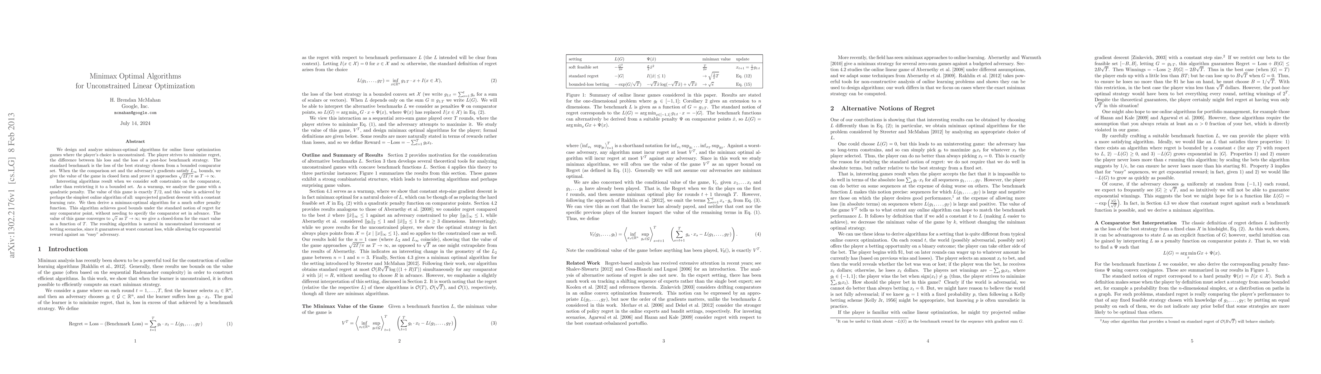 We design and analyze minimax-optimal algorithms for online linear optimization games where the player's choice is unconstrained. The player strives to minimize regret, the difference between his loss and the loss of a post-hoc benchmark strategy. The standard benchmark is the loss of the best strategy chosen from a bounded comparator set. When the the comparison set and the adversary's gradients satisfy L_infinity bounds, we give the value of the game in closed form and prove it approaches sqrt(2T/pi) as T -> infinity. Interesting algorithms result when we consider soft constraints on the comparator, rather than restricting it to a bounded set. As a warmup, we analyze the game with a quadratic penalty. The value of this game is exactly T/2, and this value is achieved by perhaps the simplest online algorithm of all: unprojected gradient descent with a constant learning rate. We then derive a minimax-optimal algorithm for a much softer penalty function. This algorithm achieves good bounds under the standard notion of regret for any comparator point, without needing to specify the comparator set in advance. The value of this game converges to sqrt{e} as T ->infinity; we give a closed-form for the exact value as a function of T. The resulting algorithm is natural in unconstrained investment or betting scenarios, since it guarantees at worst constant loss, while allowing for exponential reward against an "easy" adversary.
