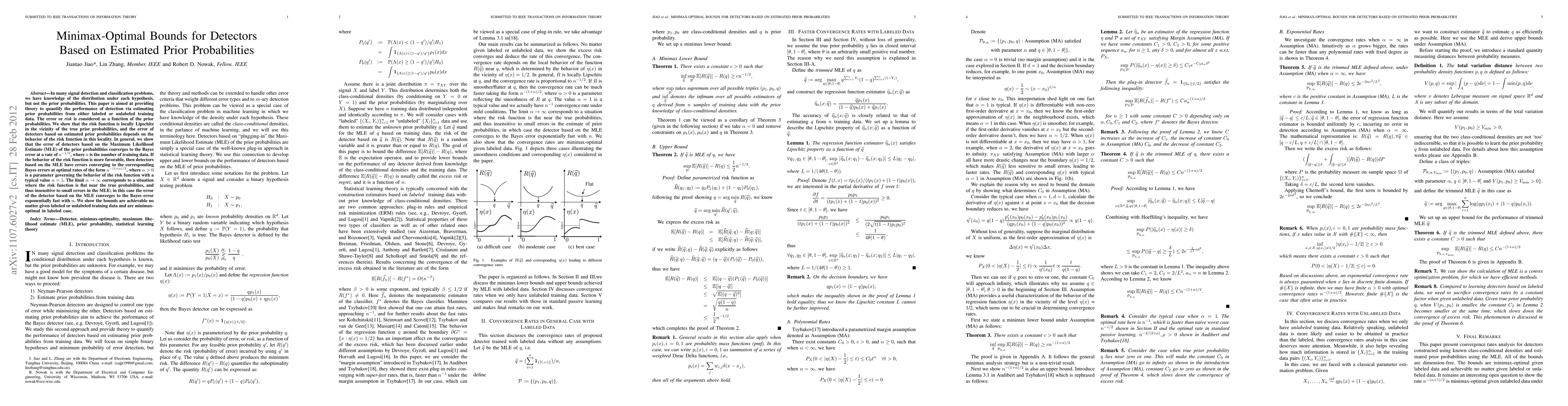 In many signal detection and classification problems, we have knowledge of the distribution under each hypothesis, but not the prior probabilities. This paper is aimed at providing theory to quantify the performance of detection via estimating prior probabilities from either labeled or unlabeled training data. The error or {\em risk} is considered as a function of the prior probabilities. We show that the risk function is locally Lipschitz in the vicinity of the true prior probabilities, and the error of detectors based on estimated prior probabilities depends on the behavior of the risk function in this locality. In general, we show that the error of detectors based on the Maximum Likelihood Estimate (MLE) of the prior probabilities converges to the Bayes error at a rate of $n^{-1/2}$, where $n$ is the number of training data. If the behavior of the risk function is more favorable, then detectors based on the MLE have errors converging to the corresponding Bayes errors at optimal rates of the form $n^{-(1+\alpha)/2}$, where $\alpha>0$ is a parameter governing the behavior of the risk function with a typical value $\alpha = 1$. The limit $\alpha \rightarrow \infty$ corresponds to a situation where the risk function is flat near the true probabilities, and thus insensitive to small errors in the MLE; in this case the error of the detector based on the MLE converges to the Bayes error exponentially fast with $n$. We show the bounds are achievable no matter given labeled or unlabeled training data and are minimax-optimal in labeled case.