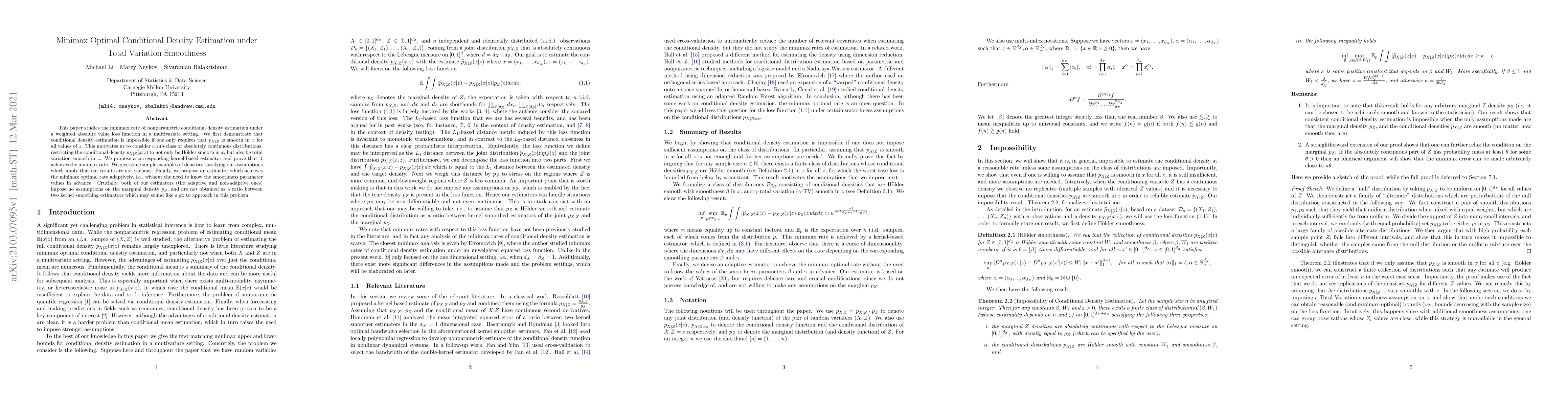 This paper studies the minimax rate of nonparametric conditional density estimation under a weighted absolute value loss function in a multivariate setting. We first demonstrate that conditional density estimation is impossible if one only requires that $p_{X|Z}$ is smooth in $x$ for all values of $z$. This motivates us to consider a sub-class of absolutely continuous distributions, restricting the conditional density $p_{X|Z}(x|z)$ to not only be H\"older smooth in $x$, but also be total variation smooth in $z$. We propose a corresponding kernel-based estimator and prove that it achieves the minimax rate. We give some simple examples of densities satisfying our assumptions which imply that our results are not vacuous. Finally, we propose an estimator which achieves the minimax optimal rate adaptively, i.e., without the need to know the smoothness parameter values in advance. Crucially, both of our estimators (the adaptive and non-adaptive ones) impose no assumptions on the marginal density $p_Z$, and are not obtained as a ratio between two kernel smoothing estimators which may sound like a go to approach in this problem.