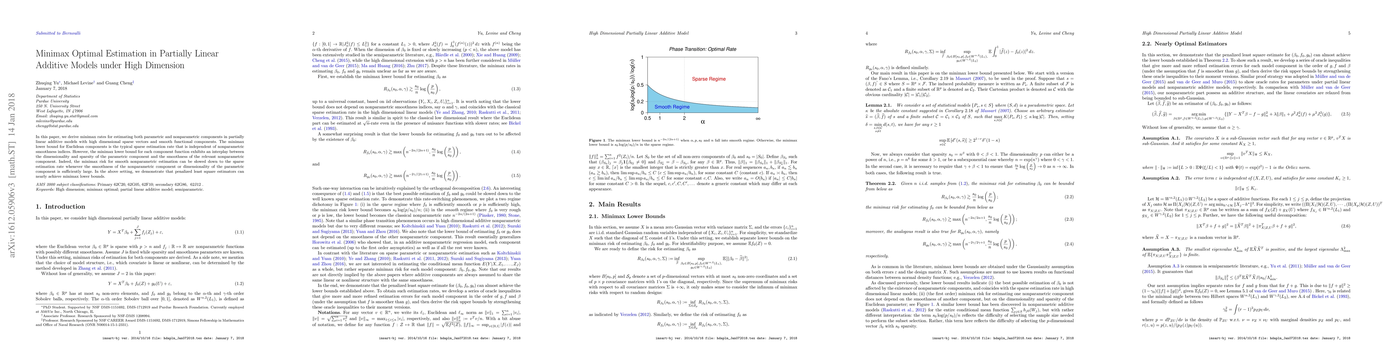 This paper establishes minimax rates for estimating components in high-dimensional partially linear additive models, showing that penalized least square estimators can nearly achieve these bounds. The minimax lower bounds reveal an interplay between dimensionality, sparsity, and smoothness, with smooth nonparametric estimation potentially slowing down to the sparse estimation rate under certain conditions.