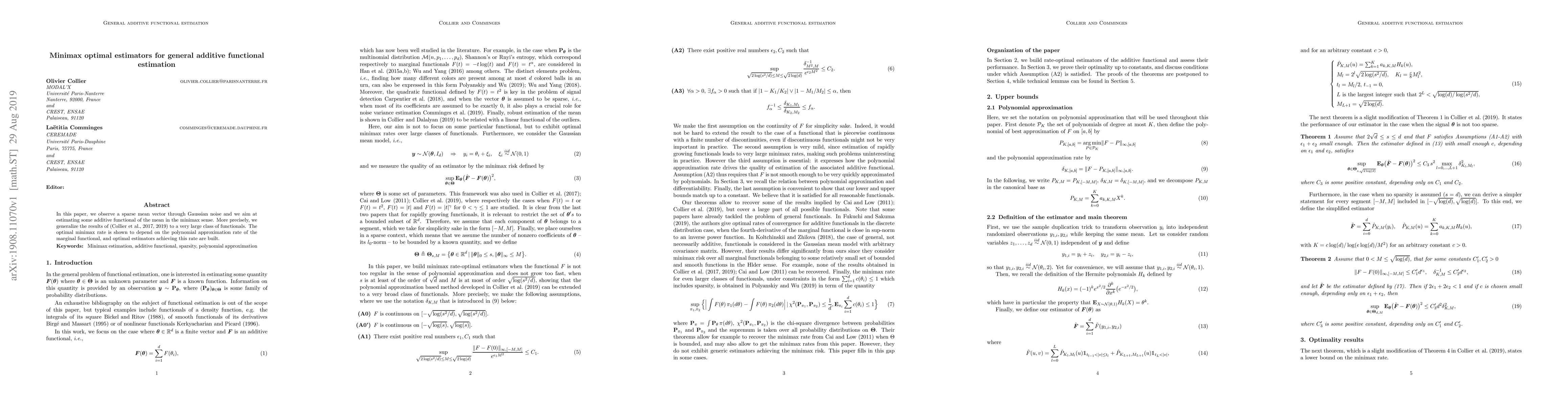 This paper develops minimax optimal estimators for estimating general additive functionals of a sparse mean vector observed through Gaussian noise. It generalizes previous results to a broad class of functionals and demonstrates that the optimal minimax rate hinges on the polynomial approximation rate of the functional, with corresponding optimal estimators constructed.