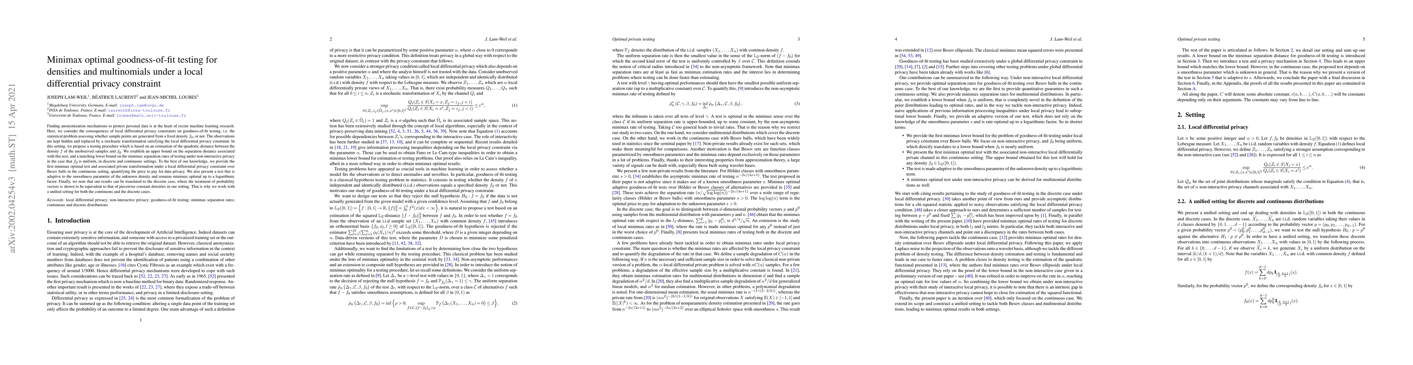 This paper develops a minimax optimal test for assessing goodness-of-fit under local differential privacy constraints, focusing on both continuous densities and multinomials. It proposes a novel testing procedure that estimates the quadratic distance between observed and hypothesized densities, while quantifying the trade-off between privacy and statistical accuracy.