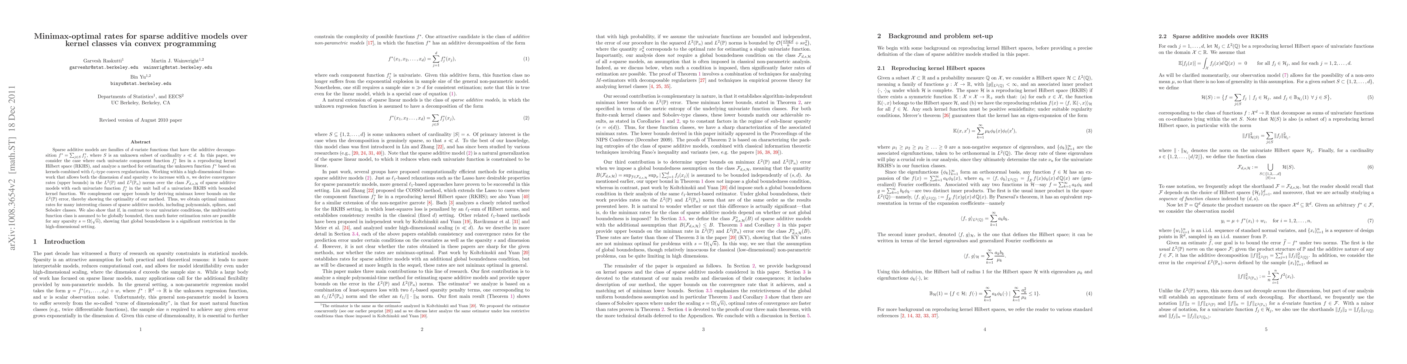 This paper develops a convex programming method for estimating sparse additive models where each component function lies in a reproducing kernel Hilbert space. The authors derive minimax-optimal convergence rates in high-dimensional settings, demonstrating the optimality of their approach through both upper and lower bounds.