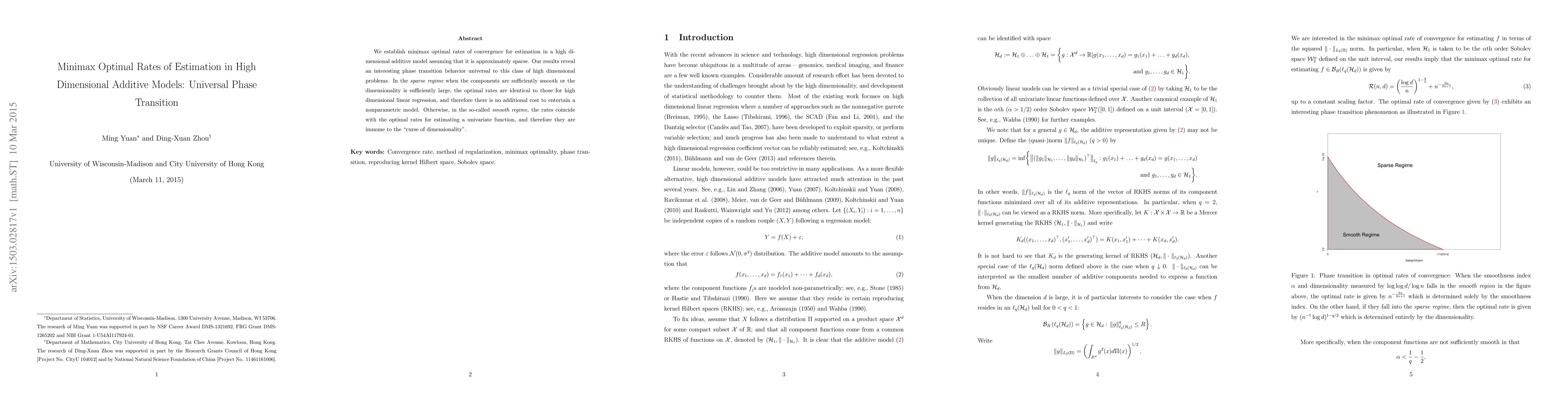 This paper establishes minimax optimal rates for estimating high-dimensional additive models that are approximately sparse, revealing a universal phase transition. In the sparse regime, optimal rates match those of high-dimensional linear regression, while in the smooth regime, they align with univariate function estimation, defying the "curse of dimensionality."