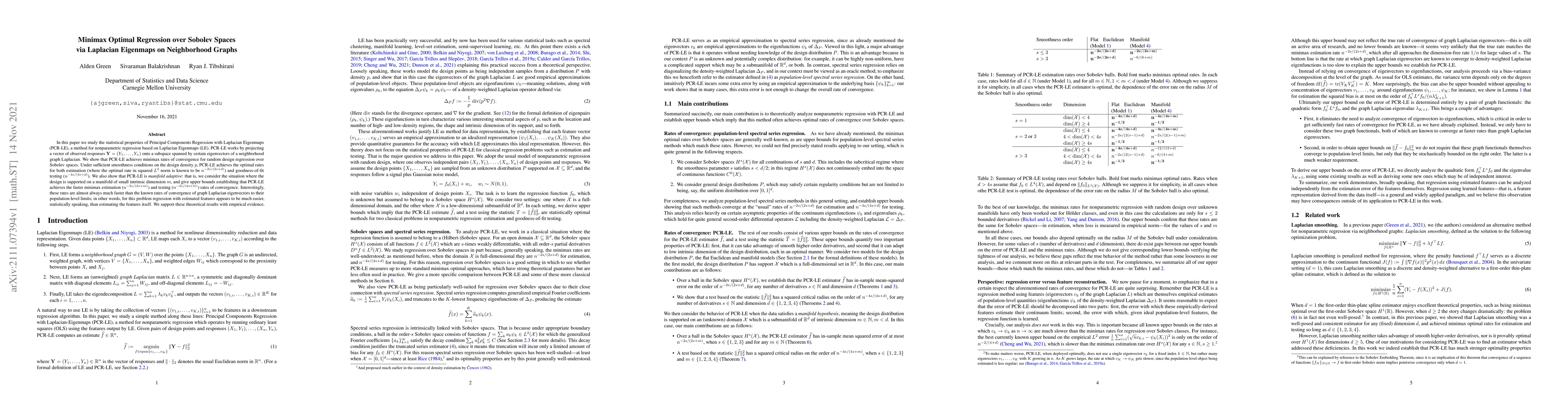 In this paper we study the statistical properties of Principal Components Regression with Laplacian Eigenmaps (PCR-LE), a method for nonparametric regression based on Laplacian Eigenmaps (LE). PCR-LE works by projecting a vector of observed responses ${\bf Y} = (Y_1,\ldots,Y_n)$ onto a subspace spanned by certain eigenvectors of a neighborhood graph Laplacian. We show that PCR-LE achieves minimax rates of convergence for random design regression over Sobolev spaces. Under sufficient smoothness conditions on the design density $p$, PCR-LE achieves the optimal rates for both estimation (where the optimal rate in squared $L^2$ norm is known to be $n^{-2s/(2s + d)}$) and goodness-of-fit testing ($n^{-4s/(4s + d)}$). We also show that PCR-LE is \emph{manifold adaptive}: that is, we consider the situation where the design is supported on a manifold of small intrinsic dimension $m$, and give upper bounds establishing that PCR-LE achieves the faster minimax estimation ($n^{-2s/(2s + m)}$) and testing ($n^{-4s/(4s + m)}$) rates of convergence. Interestingly, these rates are almost always much faster than the known rates of convergence of graph Laplacian eigenvectors to their population-level limits; in other words, for this problem regression with estimated features appears to be much easier, statistically speaking, than estimating the features itself. We support these theoretical results with empirical evidence.