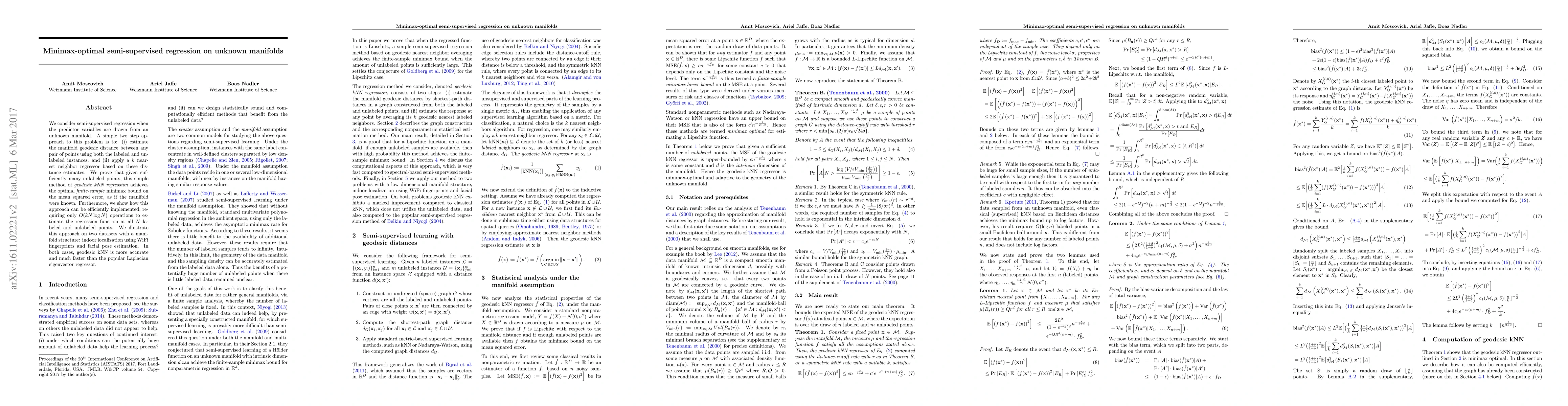 We consider semi-supervised regression when the predictor variables are drawn from an unknown manifold. A simple two step approach to this problem is to: (i) estimate the manifold geodesic distance between any pair of points using both the labeled and unlabeled instances; and (ii) apply a k nearest neighbor regressor based on these distance estimates. We prove that given sufficiently many unlabeled points, this simple method of geodesic kNN regression achieves the optimal finite-sample minimax bound on the mean squared error, as if the manifold were known. Furthermore, we show how this approach can be efficiently implemented, requiring only O(k N log N) operations to estimate the regression function at all N labeled and unlabeled points. We illustrate this approach on two datasets with a manifold structure: indoor localization using WiFi fingerprints and facial pose estimation. In both cases, geodesic kNN is more accurate and much faster than the popular Laplacian eigenvector regressor.