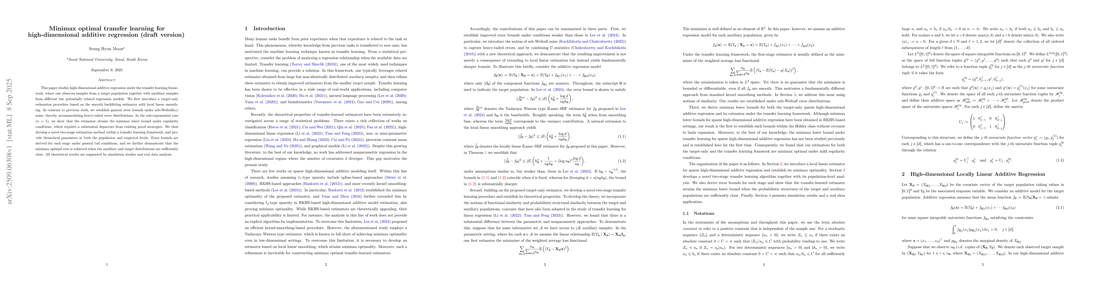 This paper studies high-dimensional additive regression under the transfer learning framework, where one observes samples from a target population together with auxiliary samples from different but potentially related regression models. We first introduce a target-only estimation procedure based on the smooth backfitting estimator with local linear smoothing. In contrast to previous work, we establish general error bounds under sub-Weibull($\alpha$) noise, thereby accommodating heavy-tailed error distributions. In the sub-exponential case ($\alpha=1$), we show that the estimator attains the minimax lower bound under regularity conditions, which requires a substantial departure from existing proof strategies. We then develop a novel two-stage estimation method within a transfer learning framework, and provide theoretical guarantees at both the population and empirical levels. Error bounds are derived for each stage under general tail conditions, and we further demonstrate that the minimax optimal rate is achieved when the auxiliary and target distributions are sufficiently close. All theoretical results are supported by simulation studies and real data analysis.
